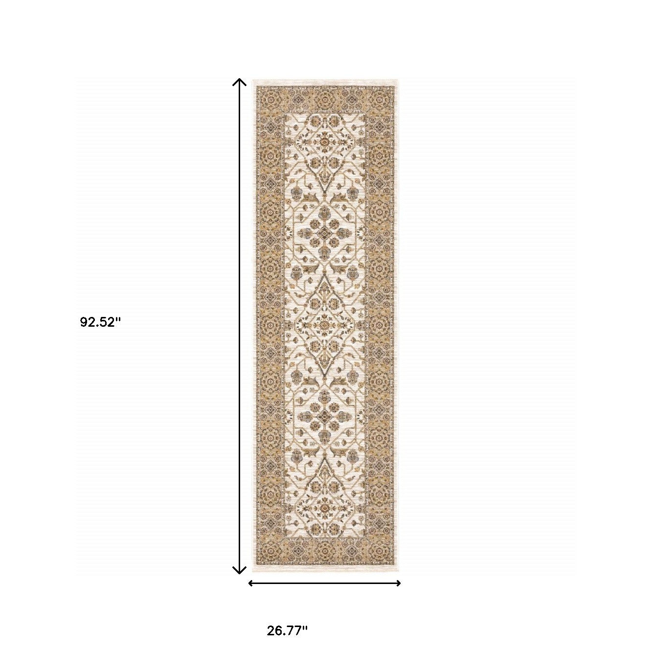 2' X 8' Ivory And Gold Oriental Power Loom Stain Resistant Runner Rug With Fringe