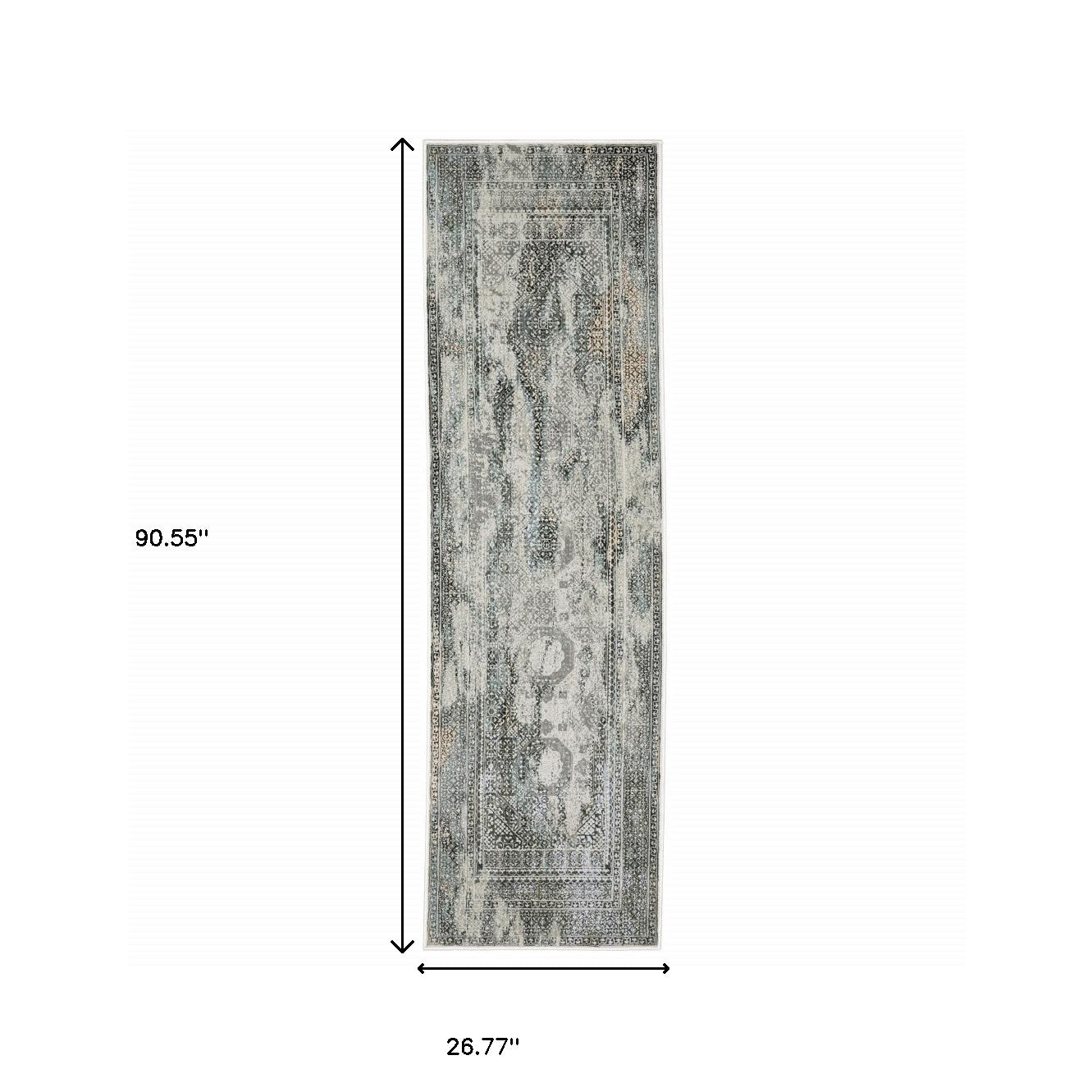 2' X 8' Ivory Grey Charcoal Blue And Rust Oriental Power Loom Stain Resistant Runner Rug