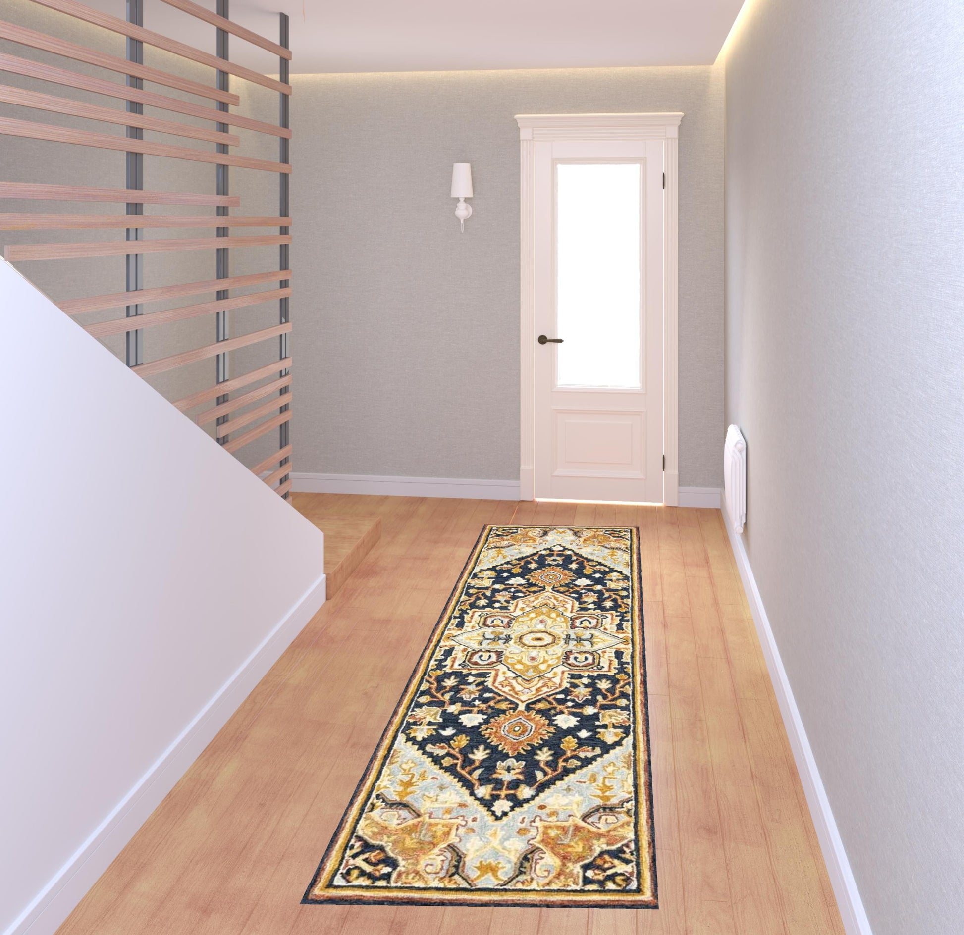 Add some artistry to your room with this 2' x 8' navy rust blue ivory and gold oriental tufted handmade stain resistant runner rug. This runner shaped rug features a oriental design in navy rust blue ivory and gold to give it visual interest. A classic shape marries with good looking design for your space Ideal for spaces with kids and pets, this rug is stain resistant to help repel stains and spilled liquids. Area Rugs help to give warmth and sense of home to your space. 0.39" H x 29.92" W x 95.67" D