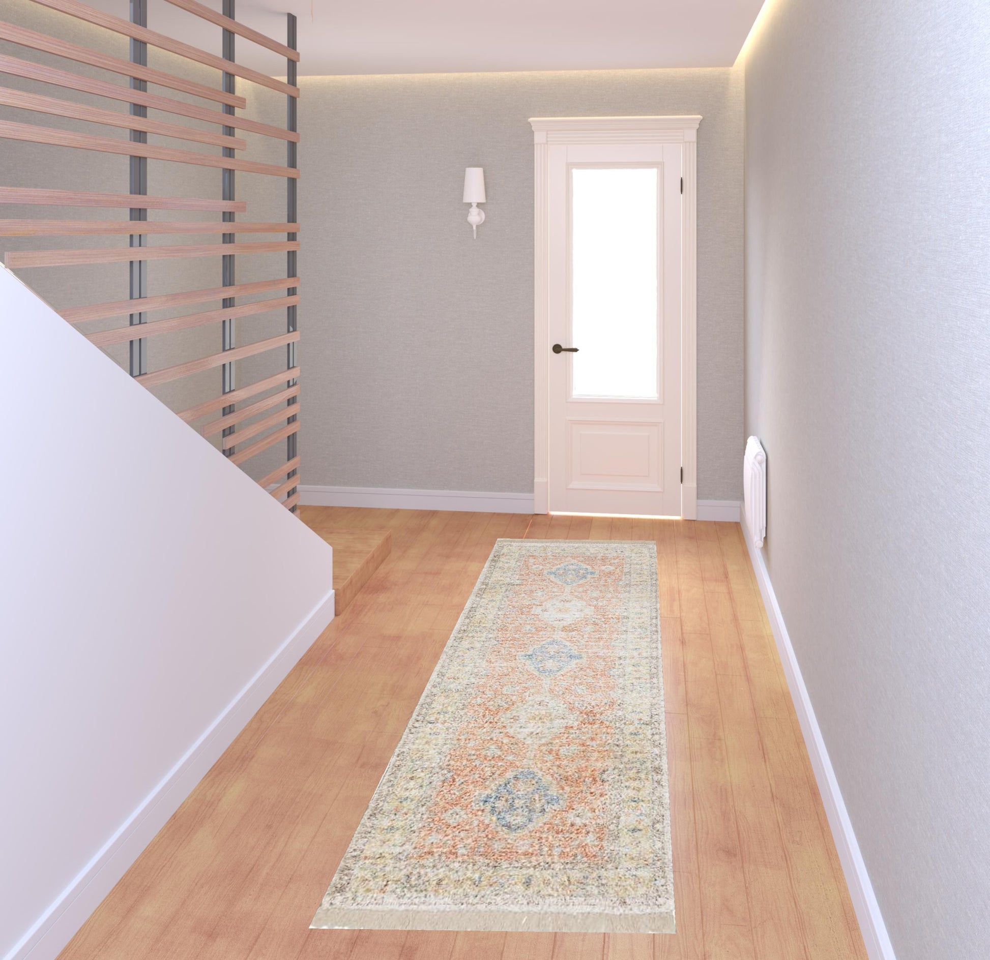 Set an inviting tone in your space with this 2' x 8' orange and blue oriental hand loomed stain resistant runner rug with fringe. This runner shaped rug features a oriental design in orange and blue to give it visual interest. A classic shape marries with good looking design for your space Ideal for spaces with kids and pets, this rug is stain resistant to help repel stains and spilled liquids. Tassel ends bring a timeless and fashionable look to your interior. Crafted by skilled artisans, this hand loomed rug is genuine and unique. No two will be exactly alike. Place this area rug against a hardwood or tile floor and it will enliven your living space with style and sophistication. 0.23" H x 29.92" W x 95.67" D