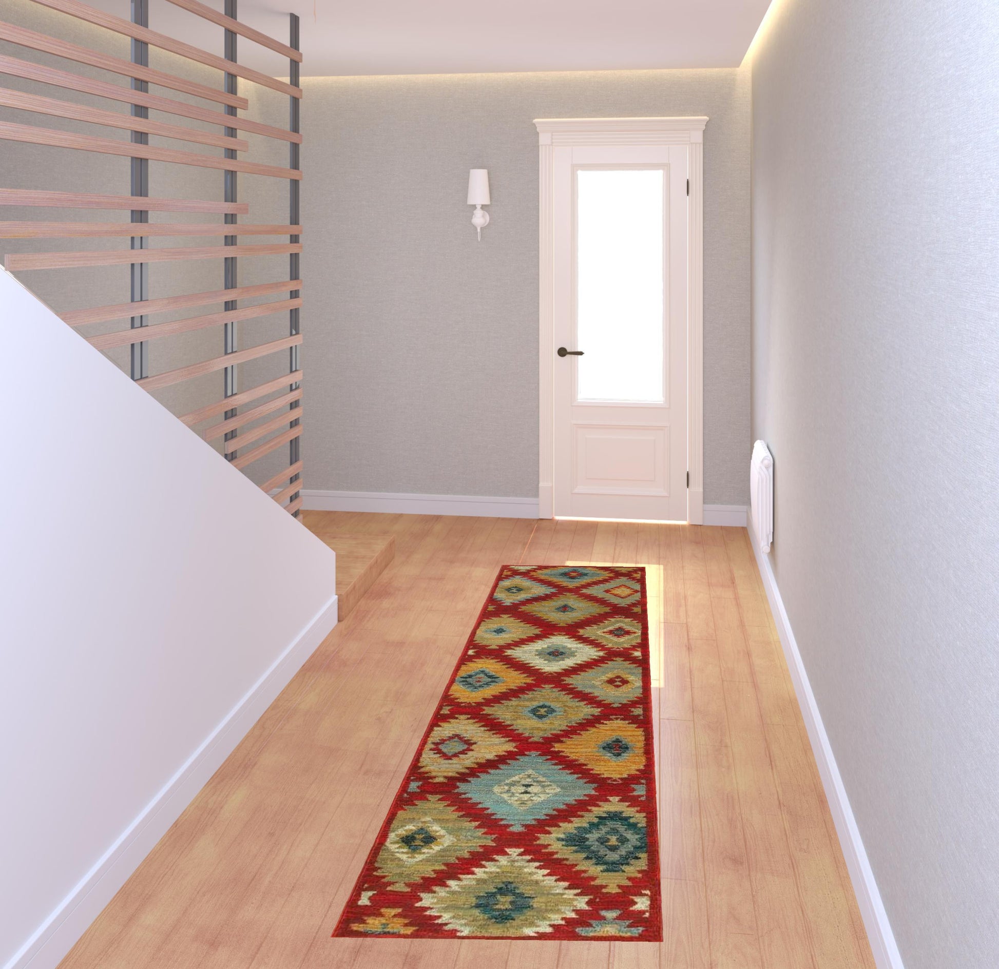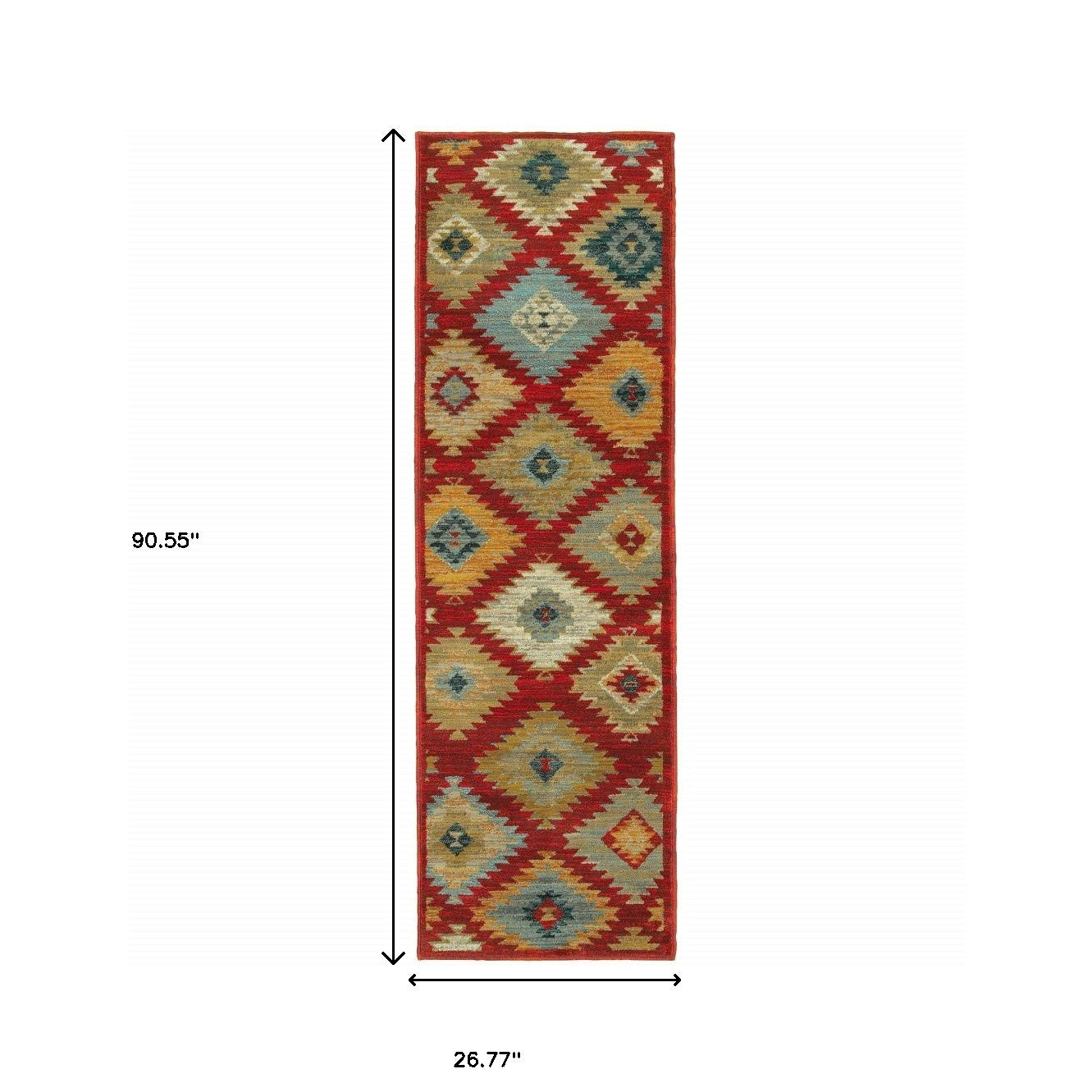 This 2' x 8' red green gold blue teal and ivory geometric power loom stain resistant runner rug, is a great way to add warmth to a room. This runner shaped rug features a geometric design in red green gold blue teal and ivory to give it visual interest. A classic shape marries with good looking design for your space Ideal for spaces with kids and pets, this rug is stain resistant to help repel stains and spilled liquids. Area Rugs help to give warmth and sense of home to your space. 0.39" H x 26.77" W x 90.55" D