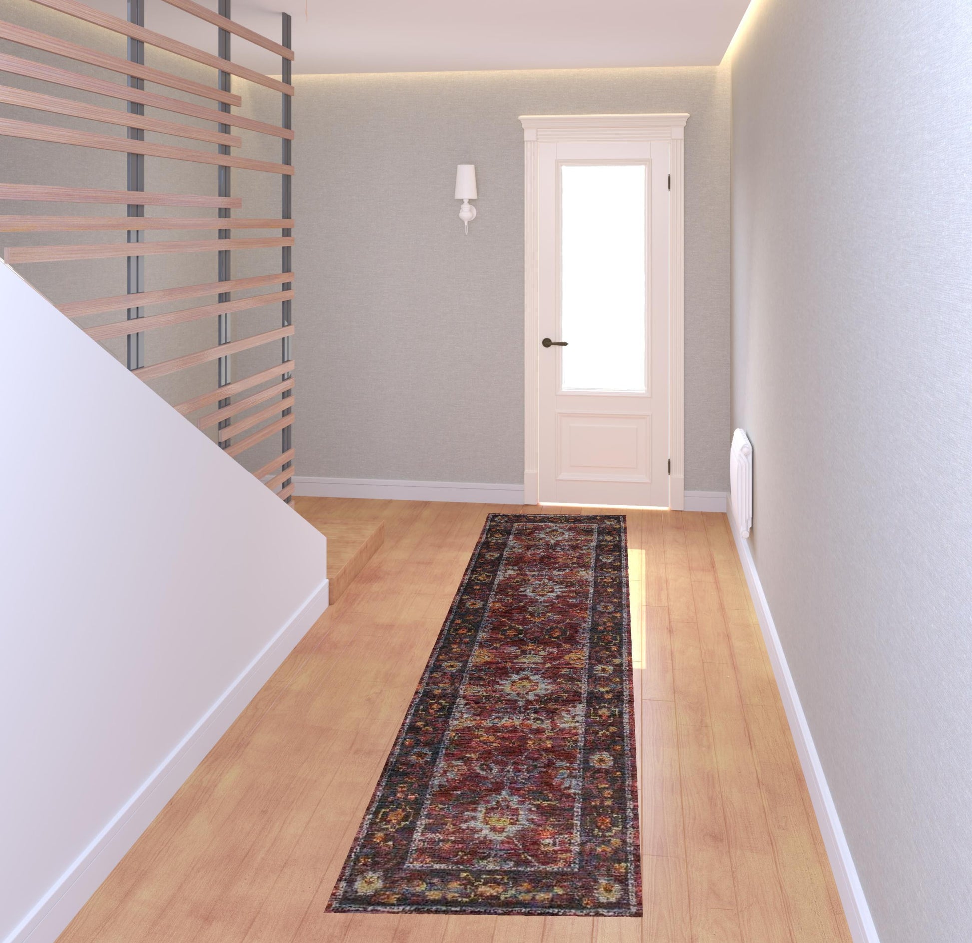 Add great coloration and comfortable texture to your space with this 2' x 8' red purple gold and grey oriental power loom stain resistant runner rug. This runner shaped rug features a oriental design in red purple gold and grey to give it visual interest. A classic shape marries with good looking design for your space Ideal for spaces with kids and pets, this rug is stain resistant to help repel stains and spilled liquids. Place this area rug against a hardwood or tile floor and it will enliven your living space with style and sophistication. 0.55" H x 26.38" W x 99.61" D