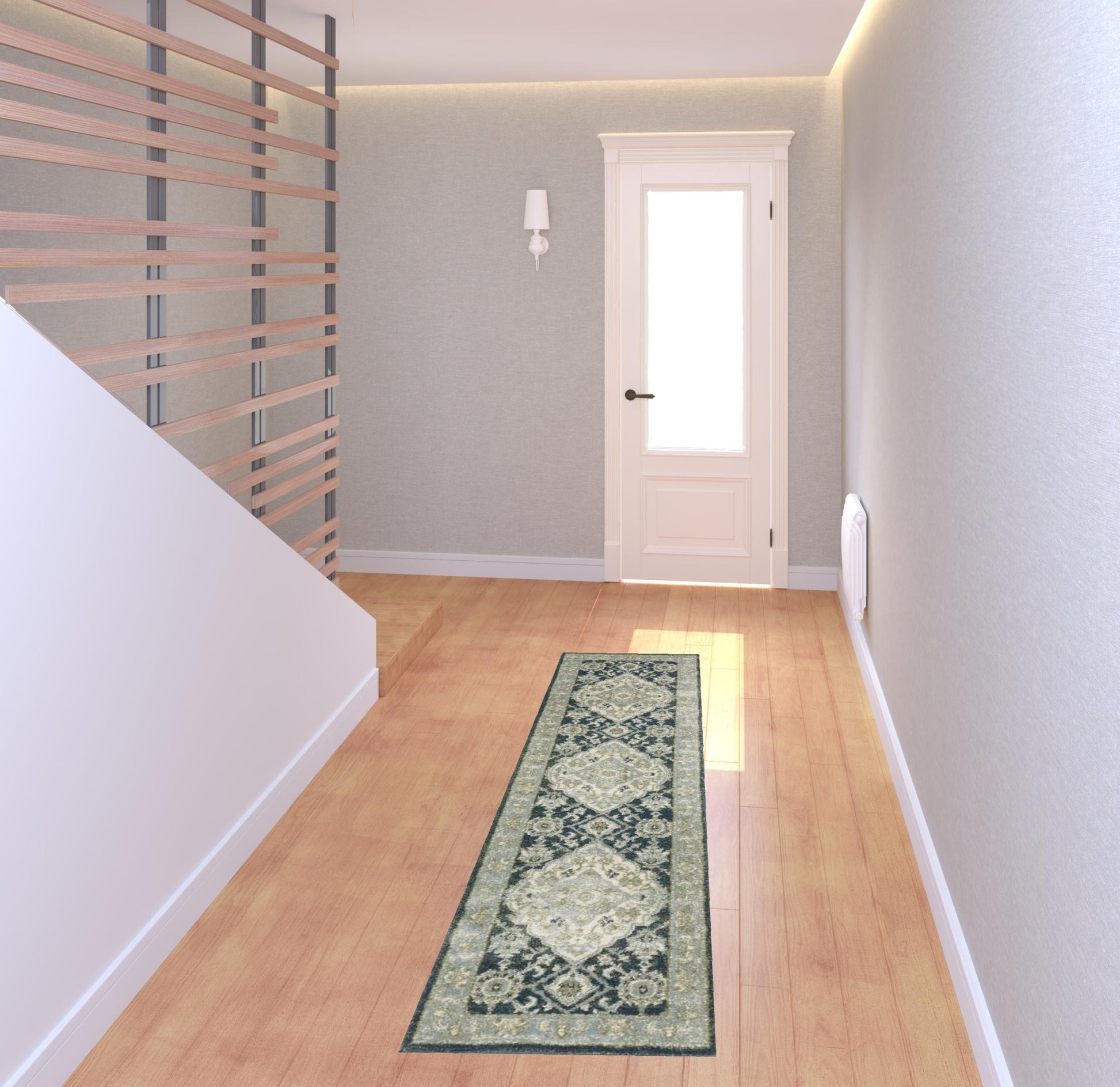 Add great coloration and comfortable texture to your space with this 2' x 8' teal blue ivory green and grey oriental power loom stain resistant runner rug. This runner shaped rug features a oriental design in teal blue ivory green and grey to give it visual interest. A classic shape marries with good looking design for your space Ideal for spaces with kids and pets, this rug is stain resistant to help repel stains and spilled liquids. Place this area rug against a hardwood or tile floor and it will enliven your living space with style and sophistication. 0.39" H x 22.83" W x 86.61" D