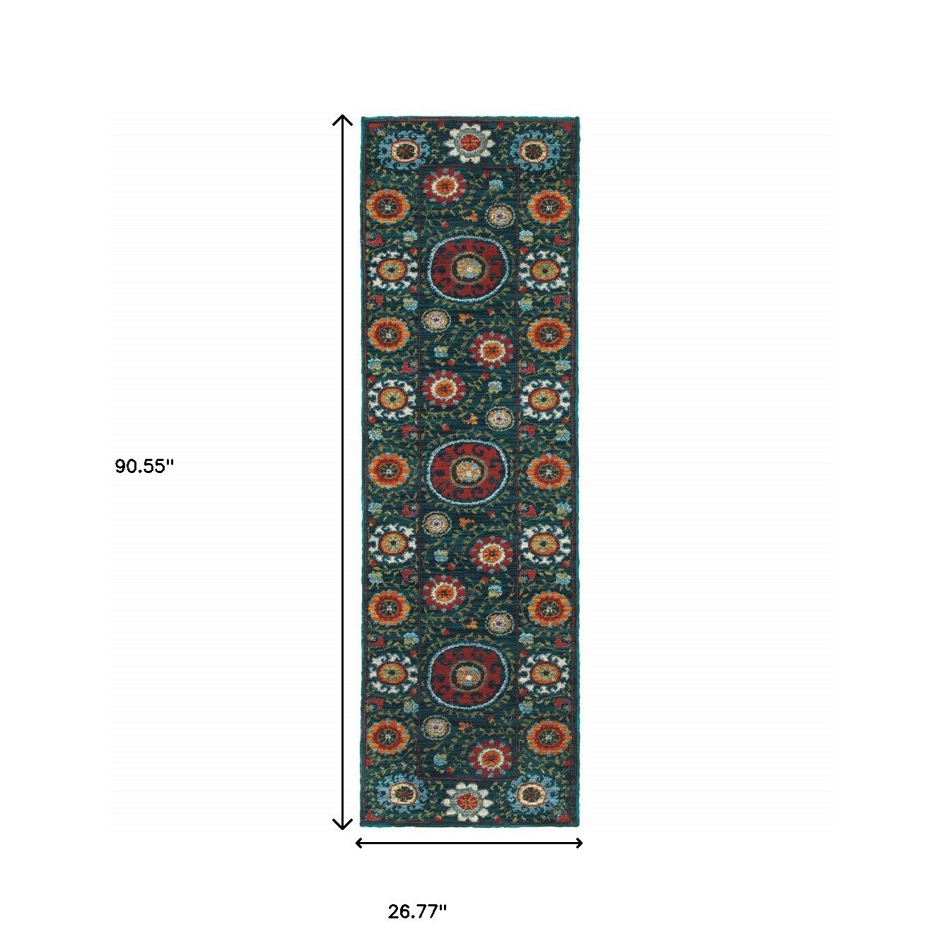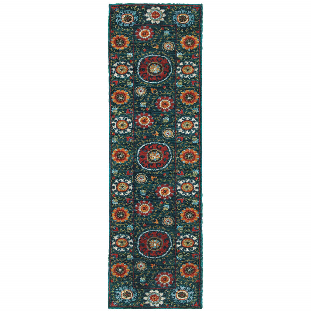 2' X 8' Teal Blue Rust Gold And Ivory Floral Power Loom Stain Resistant Runner Rug