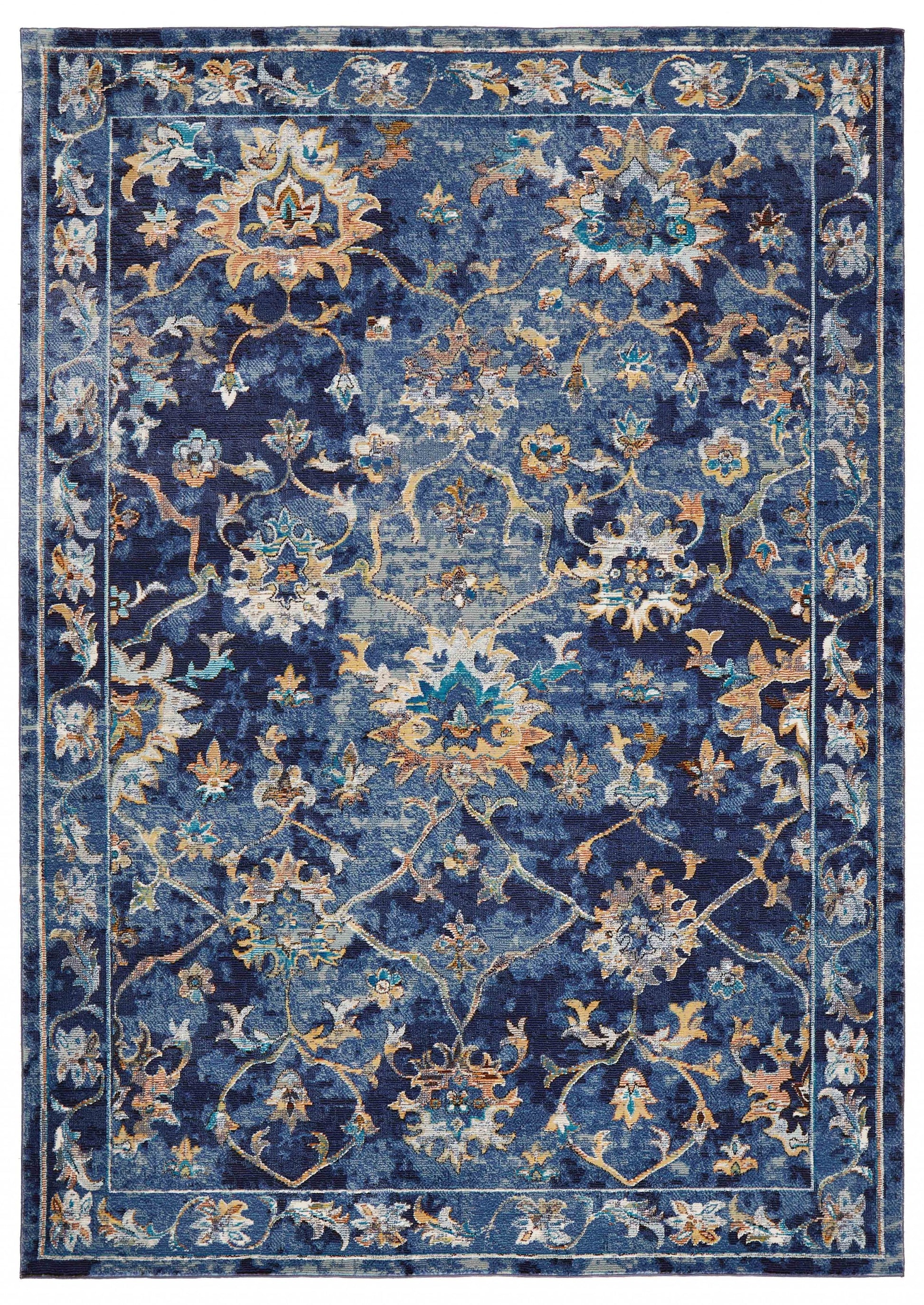 Flaunting the shades of blue in the most charismatic way, this Blue and Gold Jacobean Area Rug will adorn the floors with traditional opulence. The intricately embossed floral vines in gold and gray act as eye-catching accents over the abrash indigo base while the decorative border makes it a statement piece on the floor. Boasting the finest craftsmanship of Turkish artisans, this rug is made of sturdy polypropylene to withstand heavy traffic with low maintenance while resisting stains and spillage. Made to ensure a soft and cozy underfoot, this rug is constructed in a low pile for a smooth and luxurious surface texture. Bring home this alluring area rug to set an inviting tone and grace your home with style and elegance. 48” x 72” x 0.4”