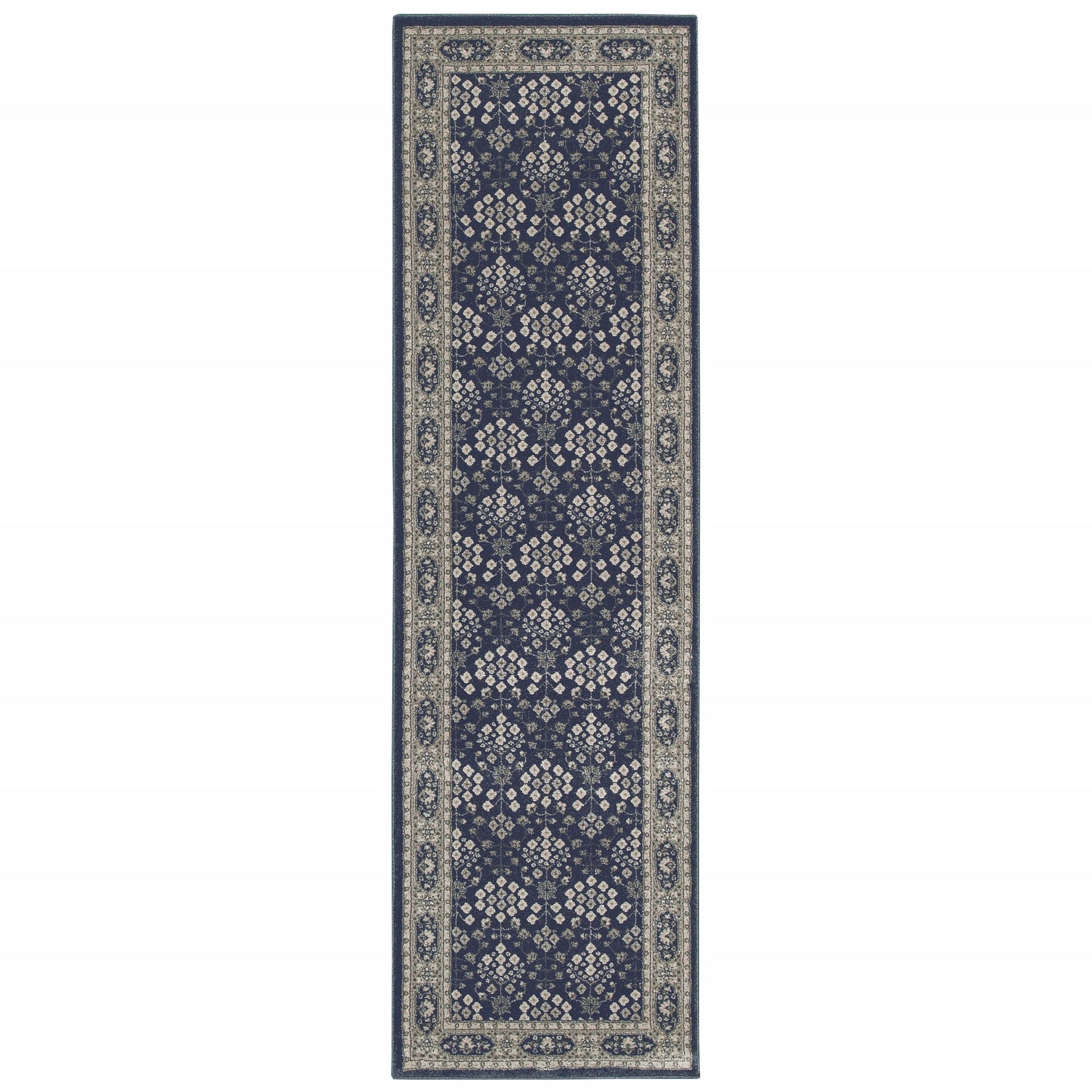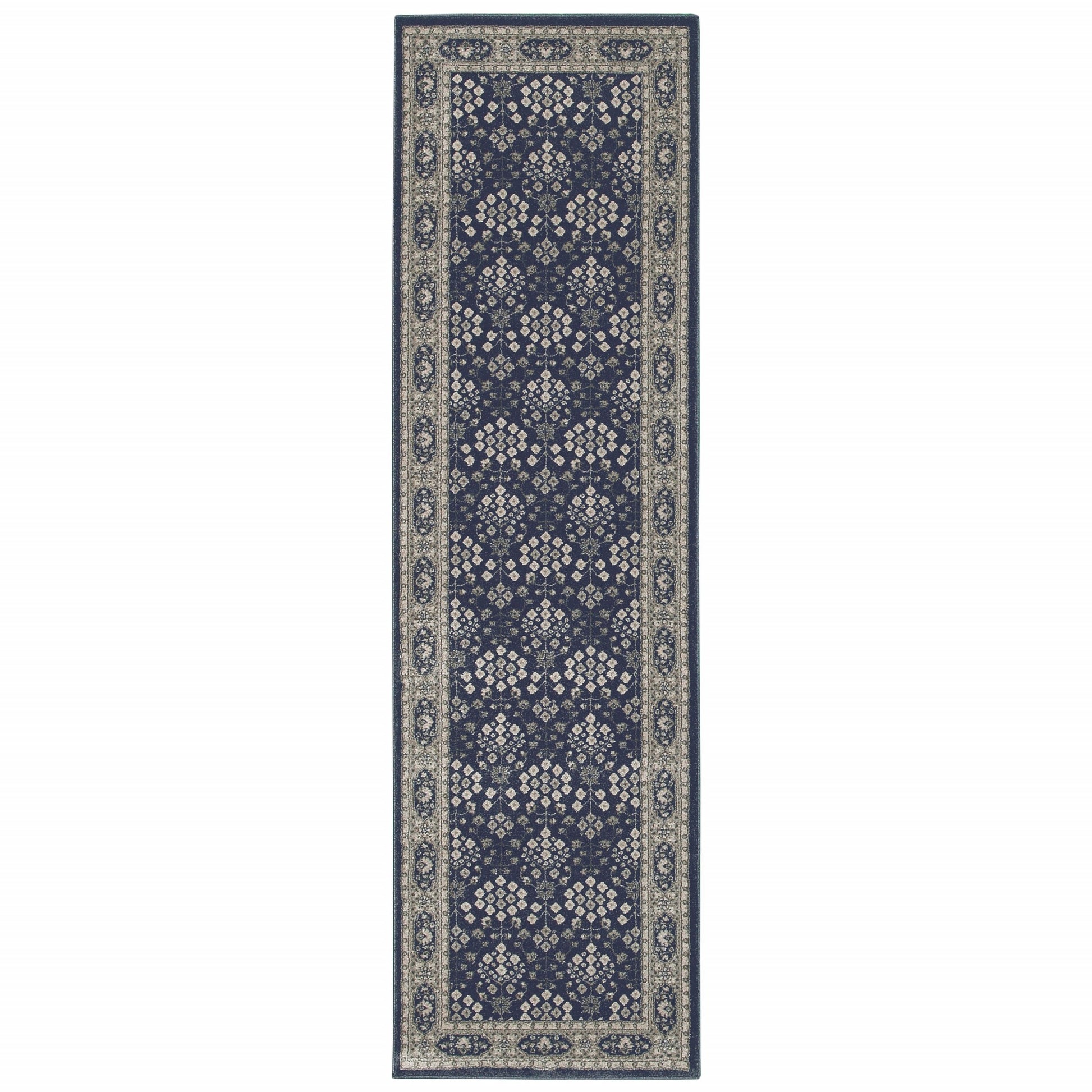 Define a retro-modern aesthetic to your living space with this uniquely classic Navy and Gray Floral Ditsy Area Rug that is wrapped in a fashion-forward color scheme with traditional design patterns. The navy blue base is flaunting the intricate floral patterns in trout gray framed with a decorative border to create visual intrigue. Made with machine-woven soft polypropylene to withstand messes and scratches in high-traffic areas indoors, keeping up to its durability and inherently stain-resistant property. The low pile texture not only adds to the surface interest for a stylish look but also promotes an inviting feel. It’s time to add a layer of traditional sophistication to your space with this beautiful area rug rolled on the floor. 0.32” x 62.99” x 90.55”