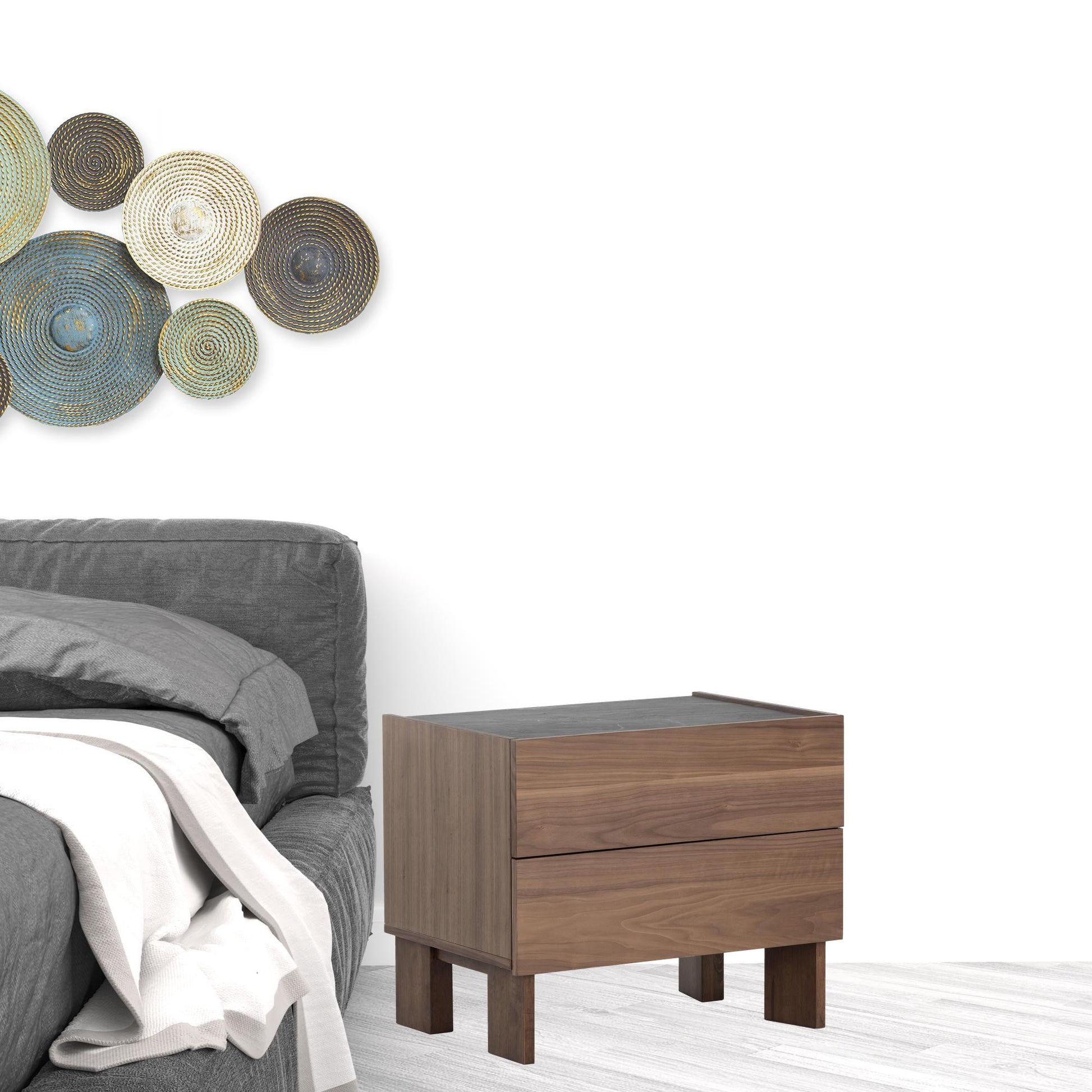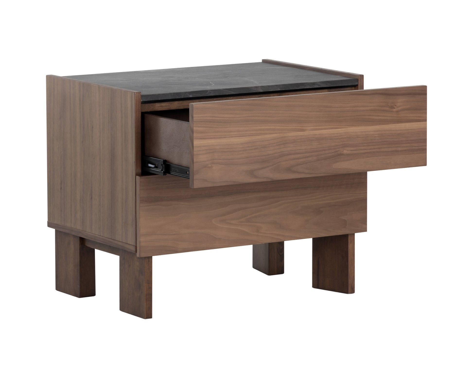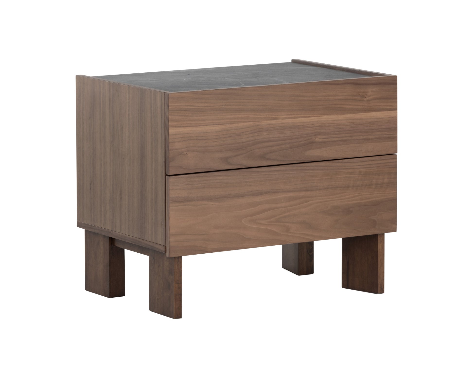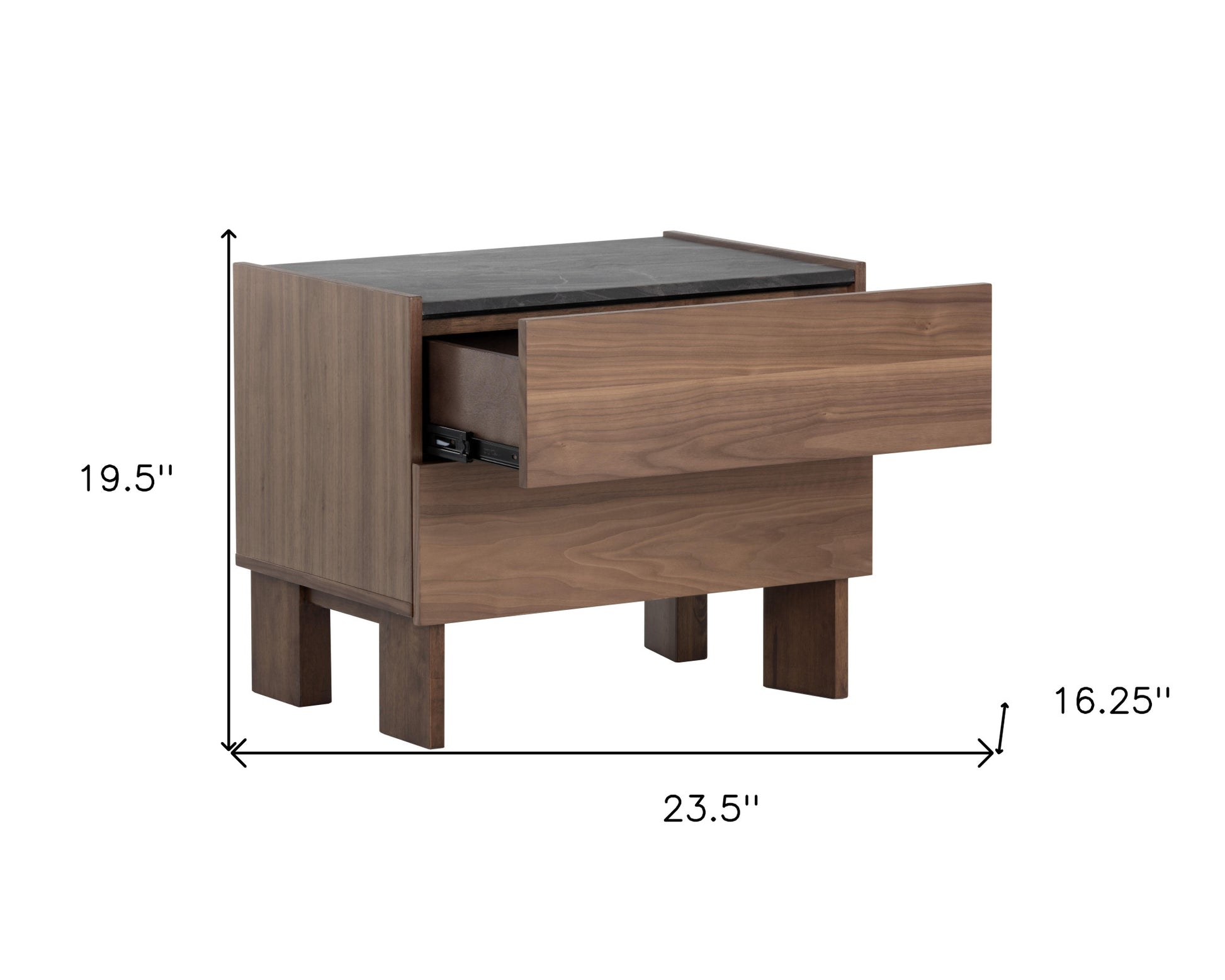 Good looking design and practical styling meet to form this 20" walnut brown and gray faux marble two drawer nightstand. Includes 2 drawers to give you multiple storage options to keep clutter at bay. Features brown manufactured wood legs that give the piece a finished look. The unsung hero of the bedroom, this nightstand is perfect for keeping a glass of water, lamp, alarm clock, jewelry and more, close by and easily accessible. Nightstands are obviously great beside the bed but can be used just as easily to help battle clutter in your living room, hallway, office, or dining room. 19.5" H x 23.5" W x 16.25" D