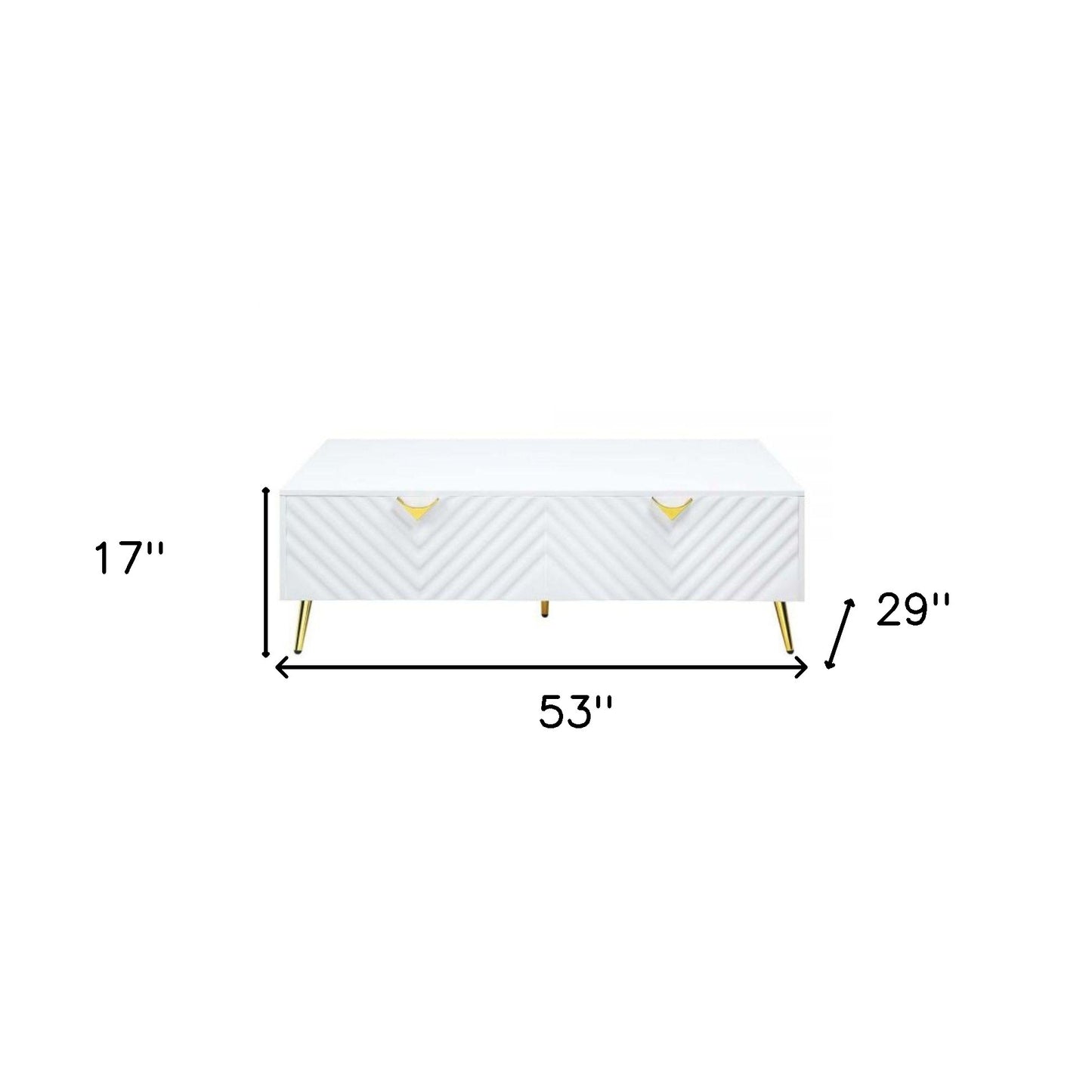 Add handsome, fashionable design to your living space with this 53-inch white metal coffee table with four drawers. A sleek white monotone color gives this metal and manufactured wood table a fresh and updated look. This rectangular table is an classic yet updated way to accent your room. If you're looking for something that can fit into a living area, bedroom, or office, this coffee table is for you. This coffee table is the sturdy, reliable and stylish answer to your living room needs. 17-inch H x 53-inch W x 29-inch D
