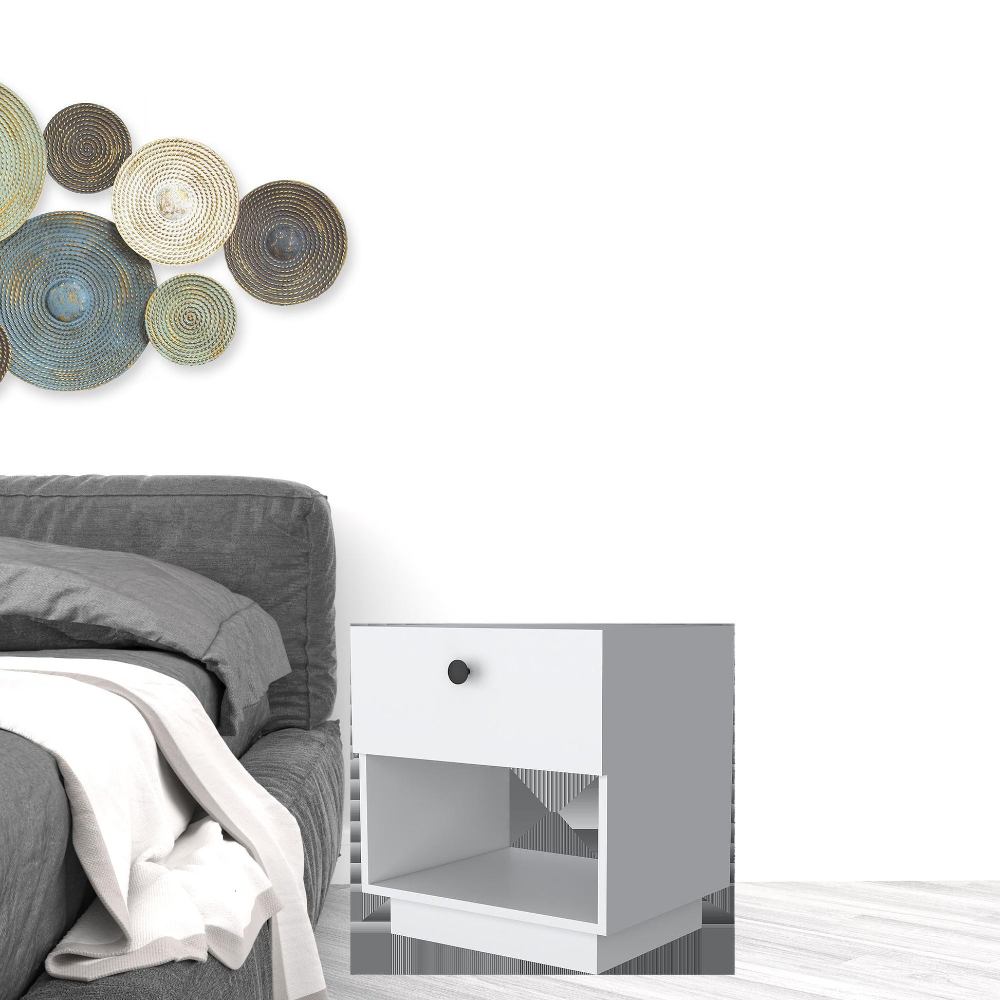 Good looking design and practical styling meet to form this 20-inch white one drawer nightstand with integrated tech. Robust in design, the bed side table has been expertly crafted from manufactured wood. Includes a drawer to help keep your essentials close by and hidden. An easy-access shelf gives you additional storage and display space. Includes integrated technology to keep you charged and connected. The unsung hero of the bedroom, this nightstand is perfect for keeping a glass of water, lamp, alarm clock, jewelry, and more, close by and easily accessible. Versatile in use this nightstand would also work as a great end table in the living room, hallway, or office. 19.7-inch H x 18.5-inch W x 15.7-inch D
