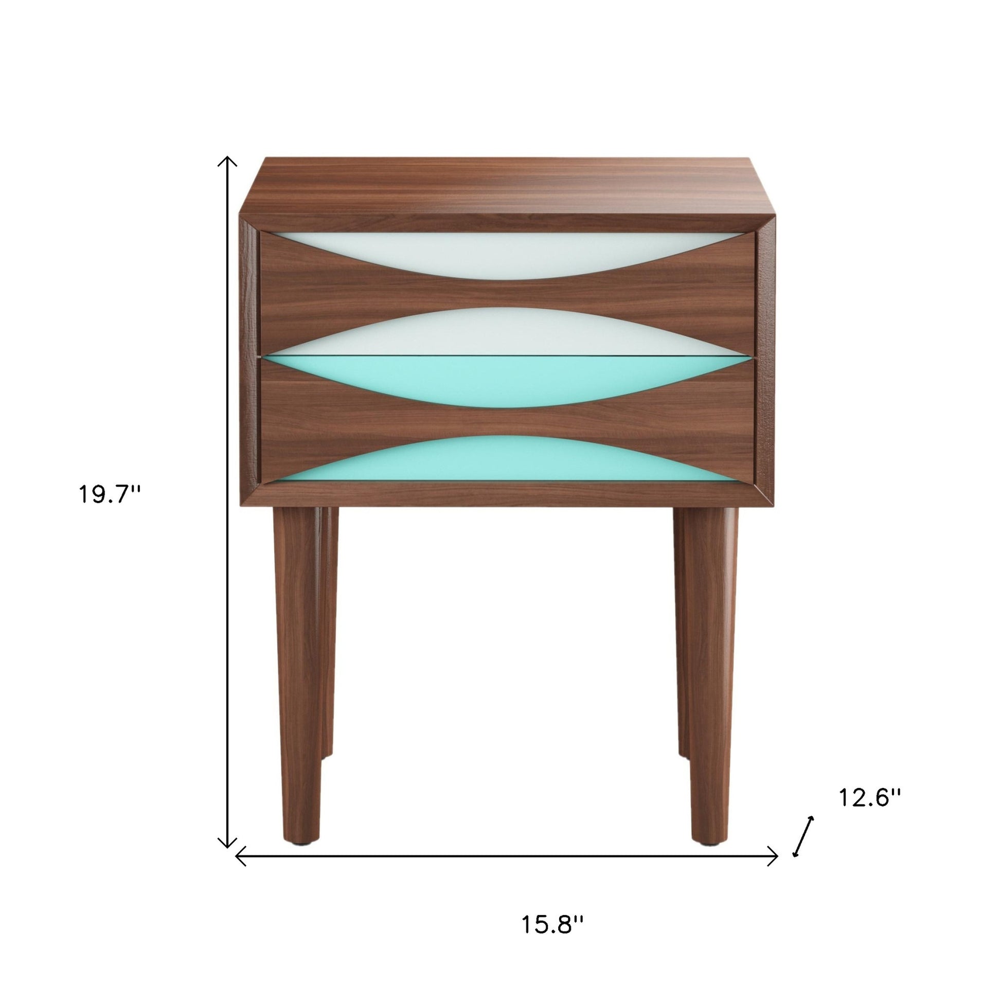 Give your room the look and feel of 5-star accommodations with this 20-inch wood brown and aqua two drawer nightstand. Made of high quality manufactured wood that is built to last. This piece has 2 drawers for your storage needs. The unsung hero of the bedroom, this nightstand is perfect for keeping a glass of water, lamp, alarm clock, jewelry, and more, close by and easily accessible. Look no further than this nightstand to accommodate all your needs and upgrade the style of your bedroom. 19.7-inch H x 15.8-inch W x 12.6-inch D
