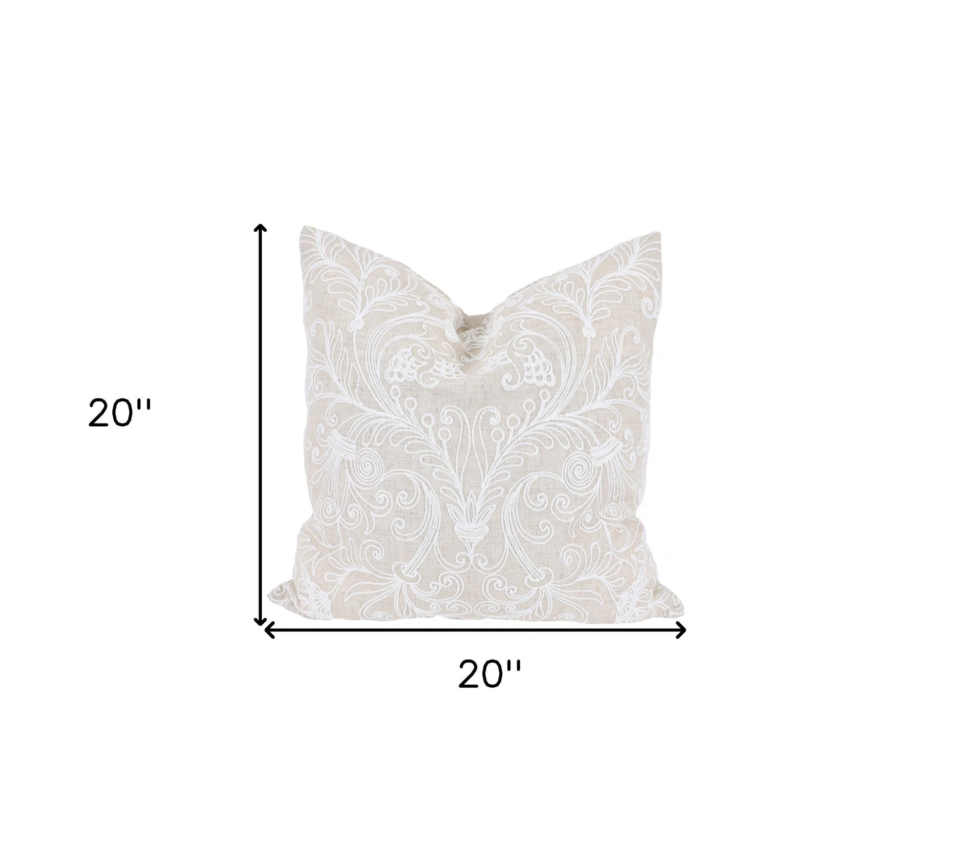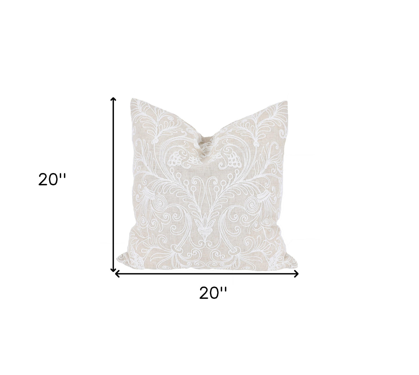 20" X 20" Beige and White Damask Polyester Zippered Pillow With Embroidery