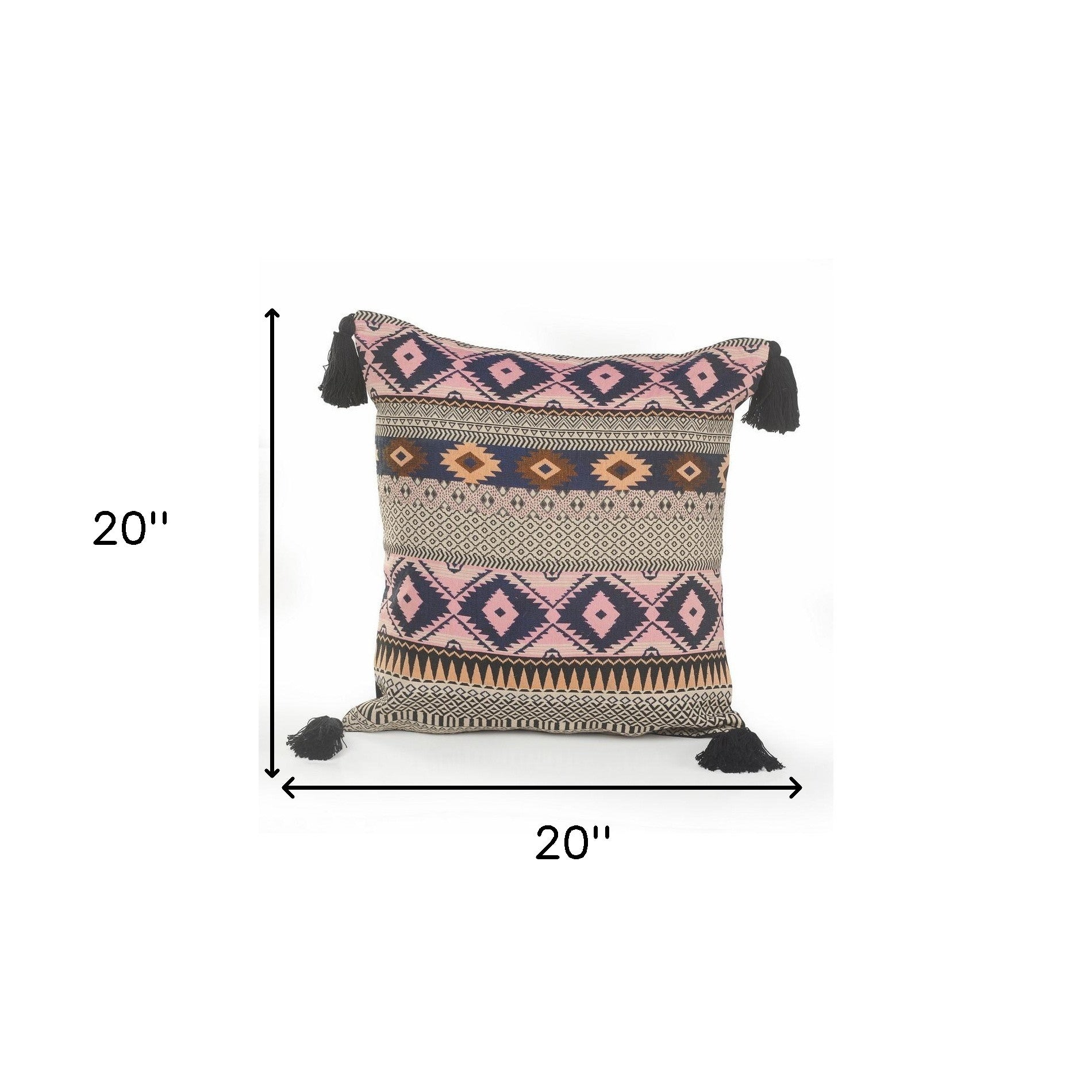 20" X 20" Black and Yellow Southwestern Cotton Zippered Pillow With Tassels