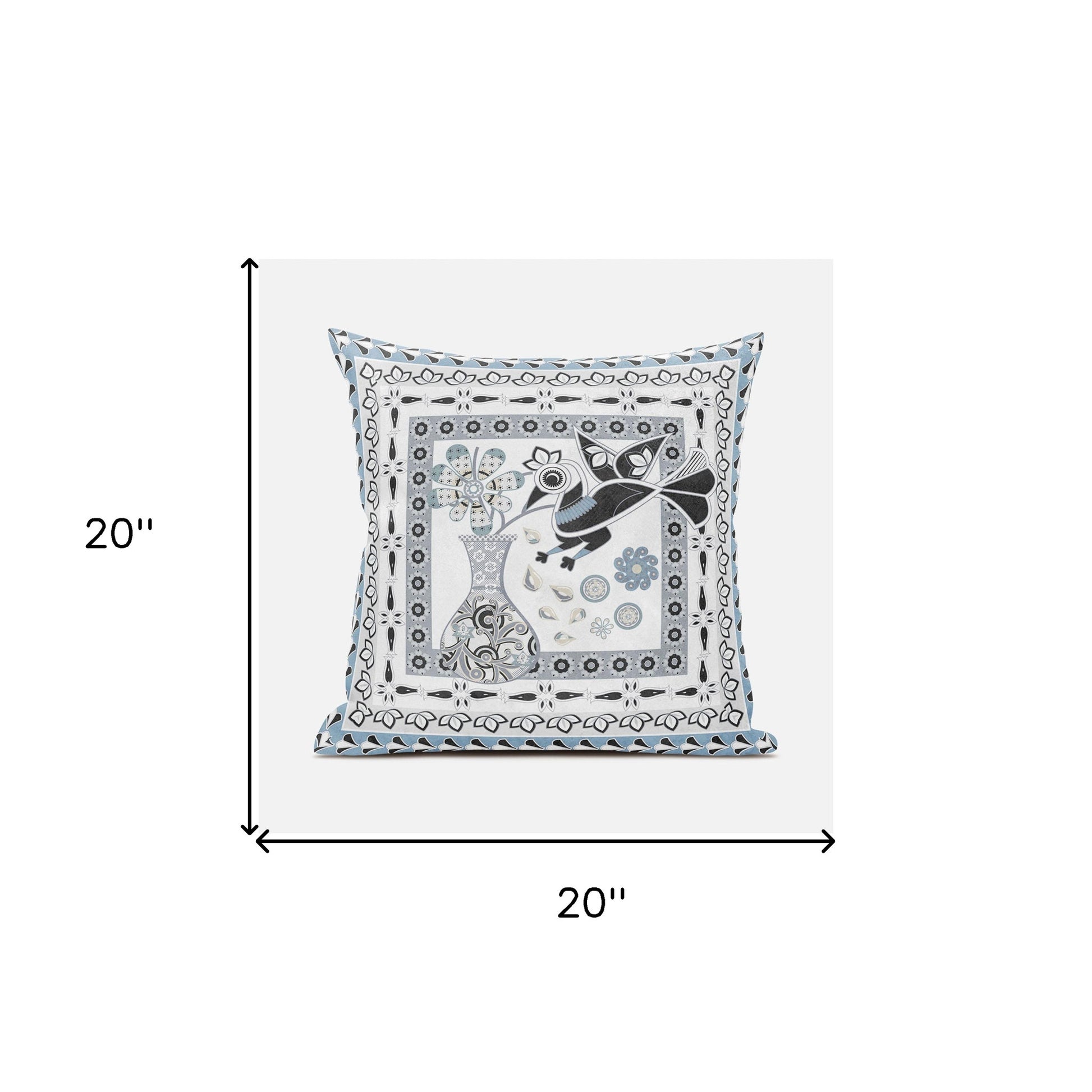 20" X 20" Black Gray and White Peacock Broadcloth Floral Zippered Pillow