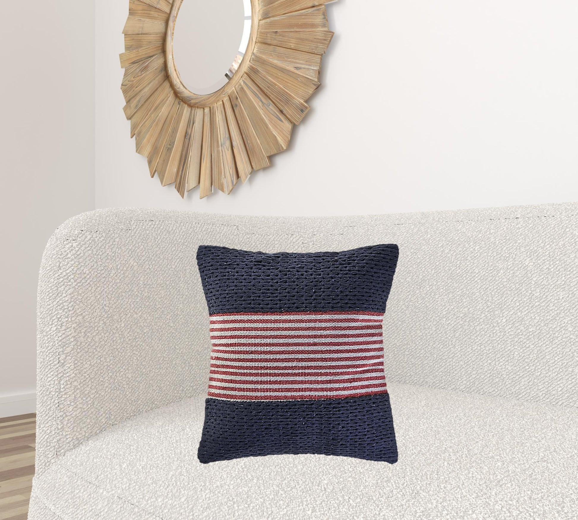 20" X 20" Blue And Red 100% Cotton Striped Zippered Pillow
