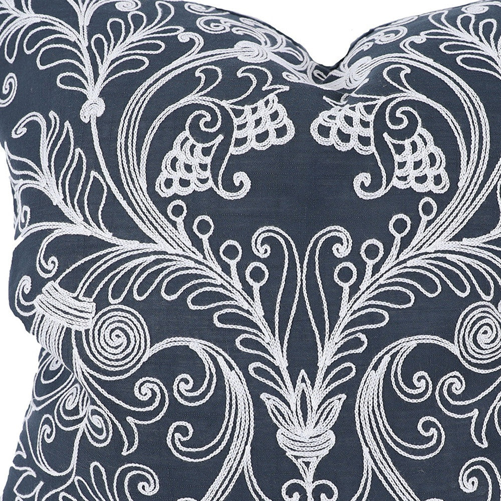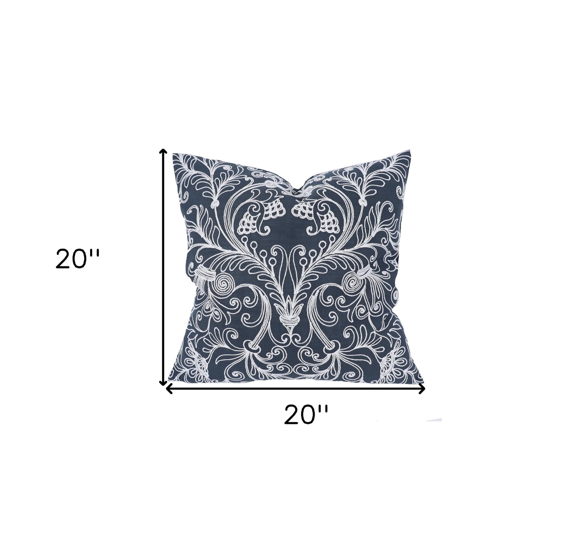 20" X 20" Blue and White Damask Polyester Zippered Pillow With Embroidery
