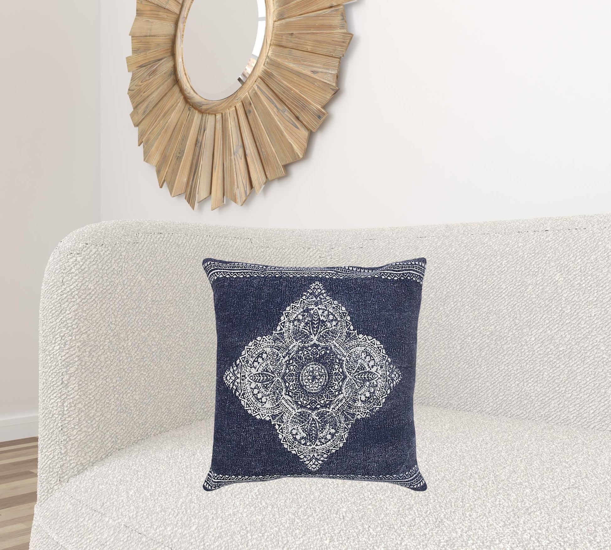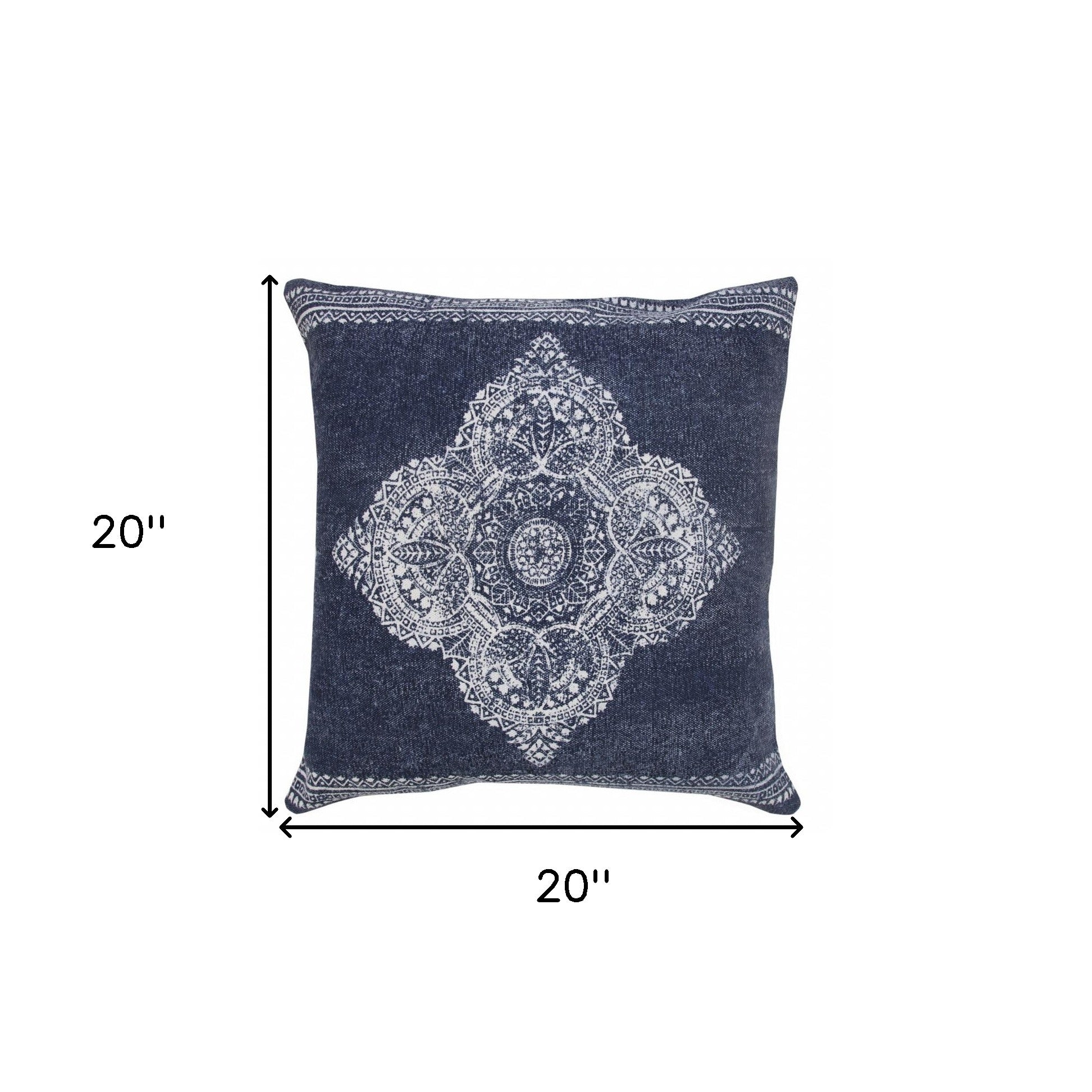 20" X 20" Dark Blue And White 100% Cotton Geometric Zippered Pillow