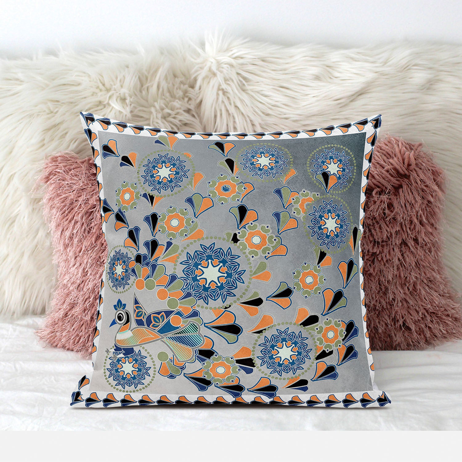 20" X 20" Gray and White Peacock Broadcloth Floral Zippered Pillow