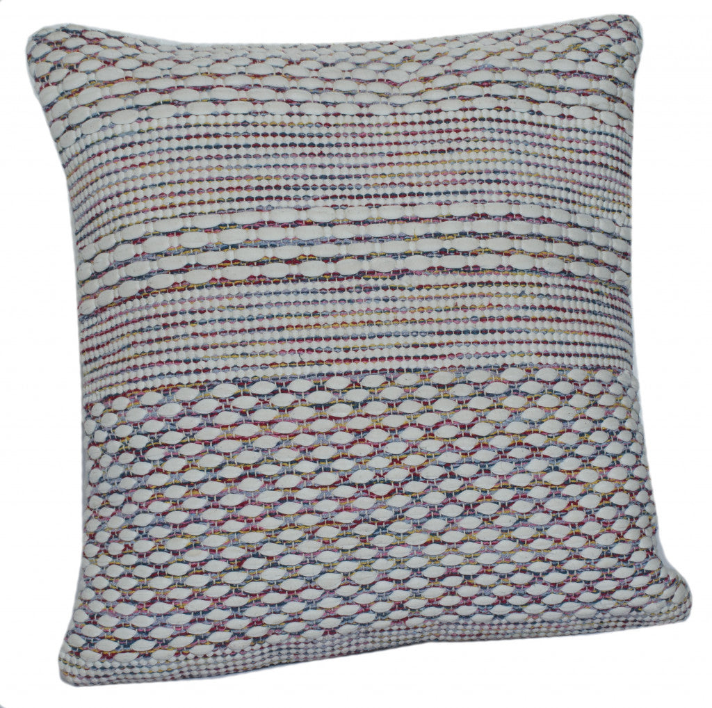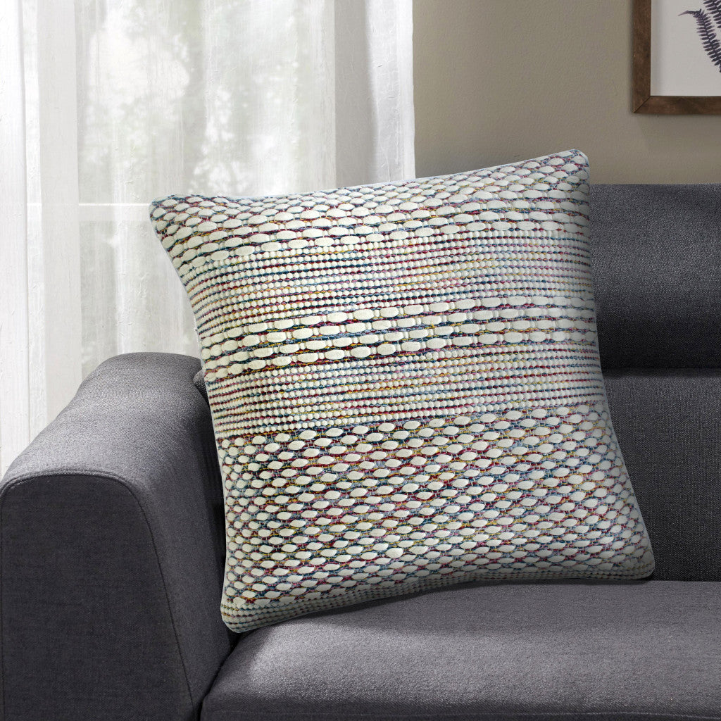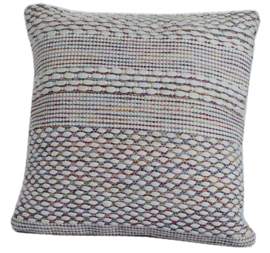 This 20" x 20" ivory red green blue yellow and orange 100% cotton geometric zippered pillow will add a beautiful decorative accent to your decor. The ivory red green blue yellow and orange coloring of the soft and long lasting 100% cotton will add dimension and texture to your space. Decorative throw pillows not only add color and dimension to your space but can be comfy and supportive when you are lounging and cuddling as well. Decorative pillows are a great way to change up the look and feel of your space easily and quickly. 4" H x 20" W x 20" D