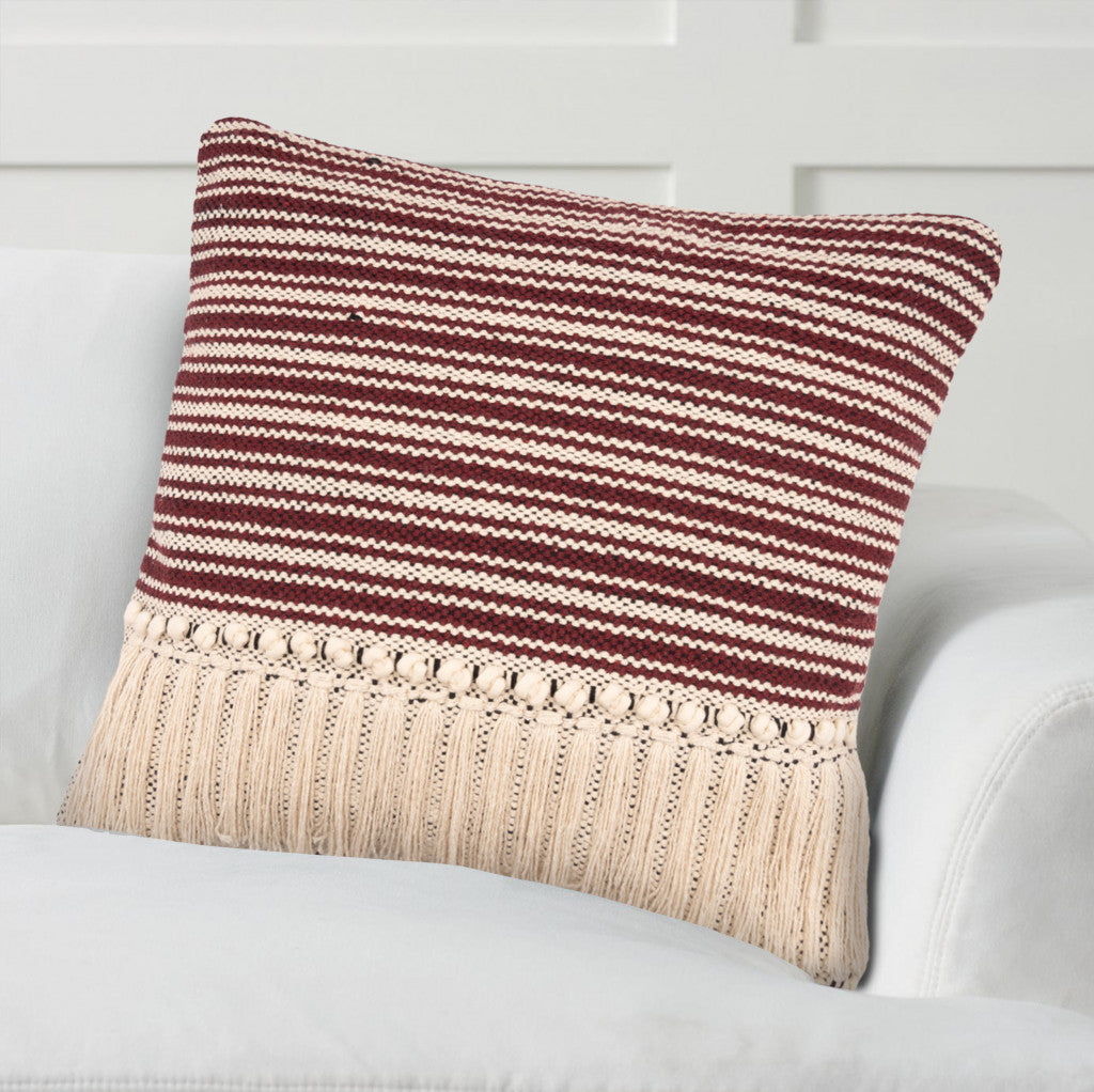 This 20" x 20" maroon red and off-white 100% cotton striped zippered pillow will add a beautiful decorative accent to your decor. This maroon red and off-white hued piece represents quality construction, expertly made from premium 100% cotton that is not only long lasting but super soft to the touch as well. Decorative throw pillows not only add color and dimension to your space but can be comfy and supportive when you are lounging and cuddling as well. Decorative pillows are a great way to change up the look and feel of your space easily and quickly. 4" H x 20" W x 20" D
