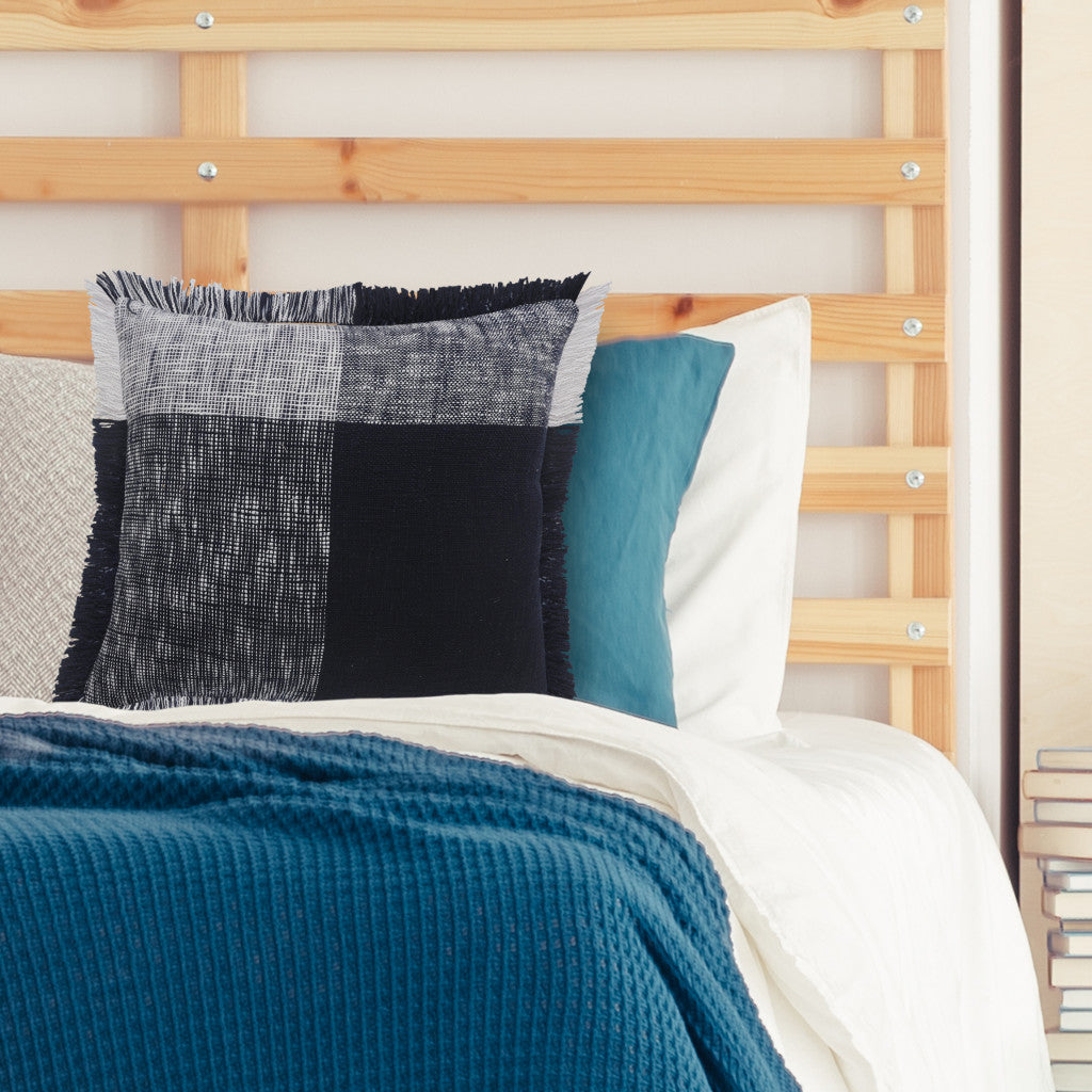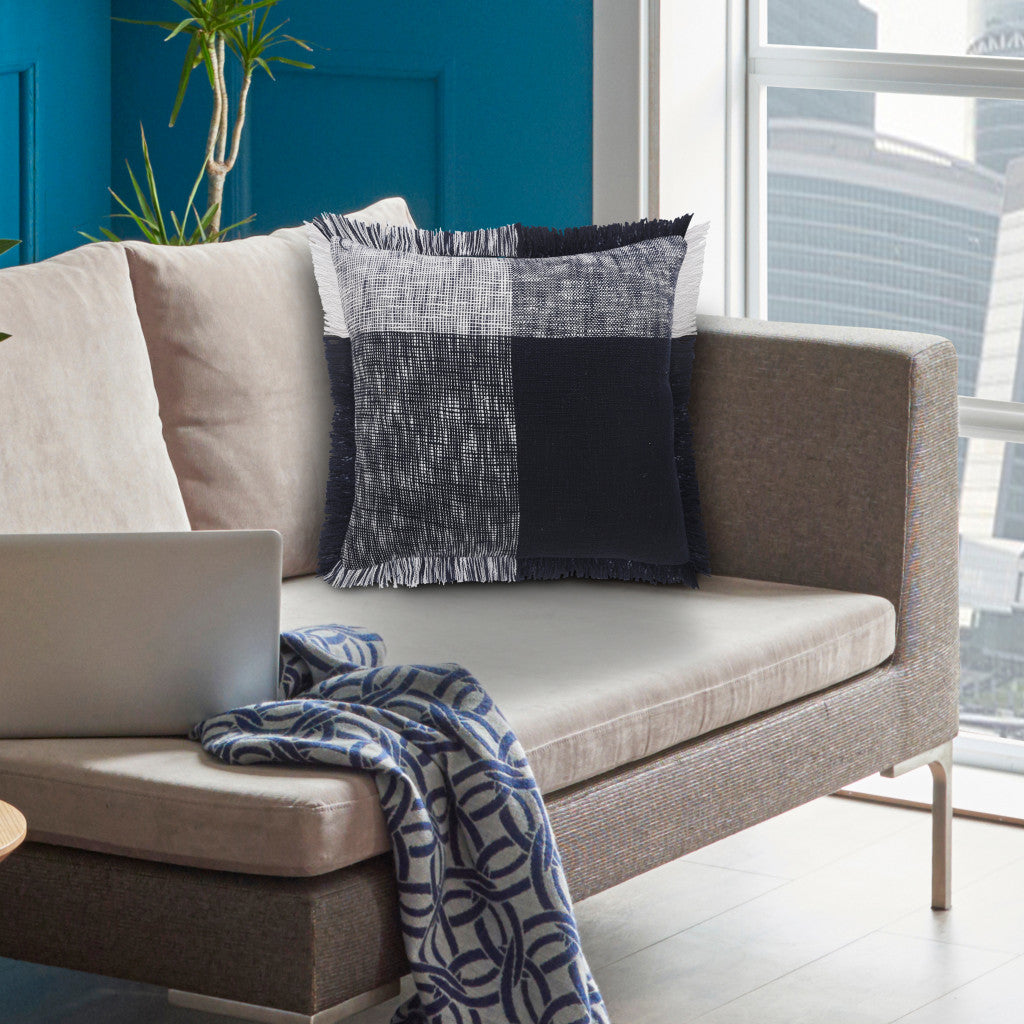 Unique and decorative, this comfortable 20" x 20" navy blue and white 100% cotton plaid zippered pillow will leave a lasting impression. Soft and textural navy blue and white 100% cotton has been used to make this pillow look and feel like a real treasure. Great to use on its own or mix with other decorations for the perfect look. A great decorative accessory for your favorite chair, to accent your sofa, or to use as part of your bed ensemble. 4" H x 20" W x 20" D