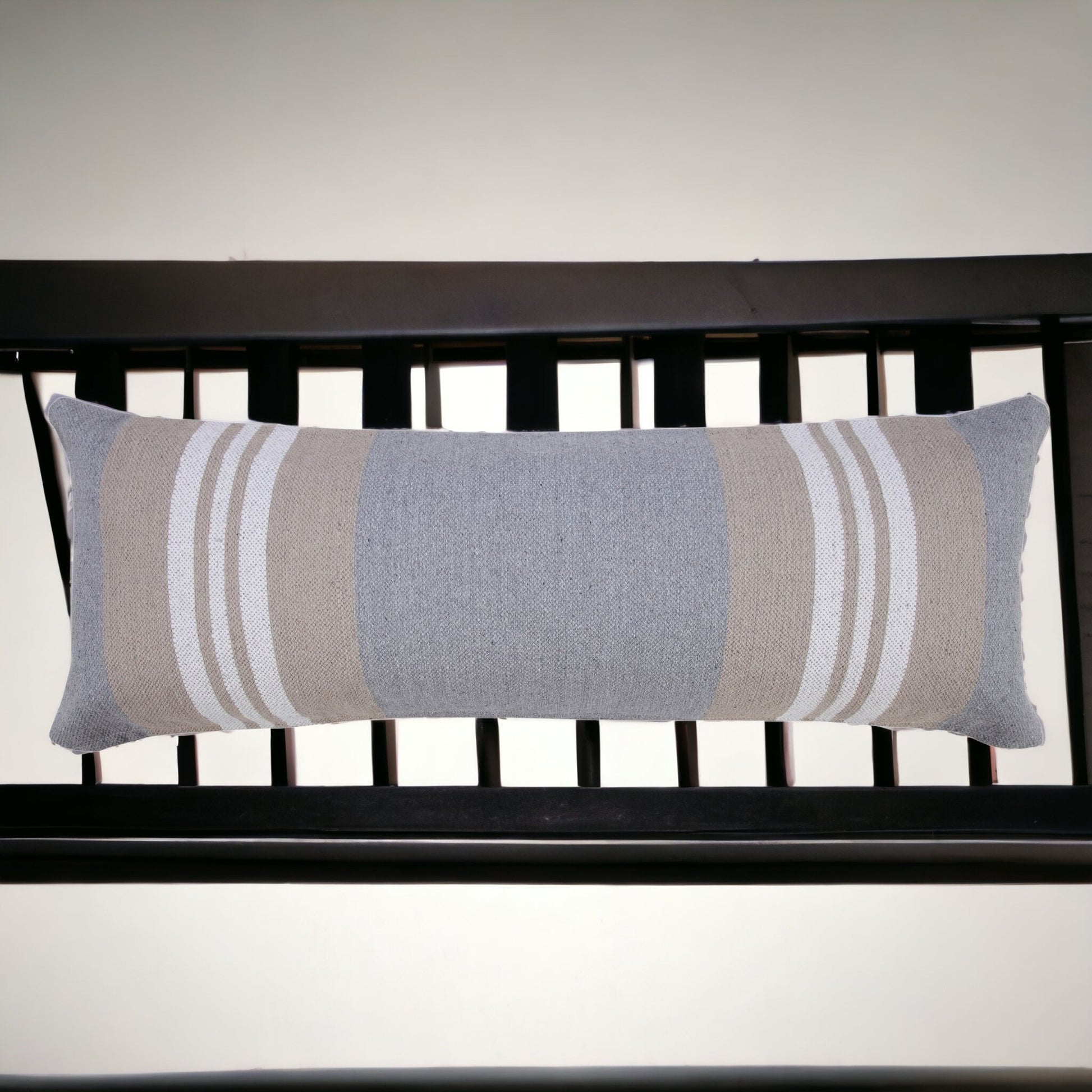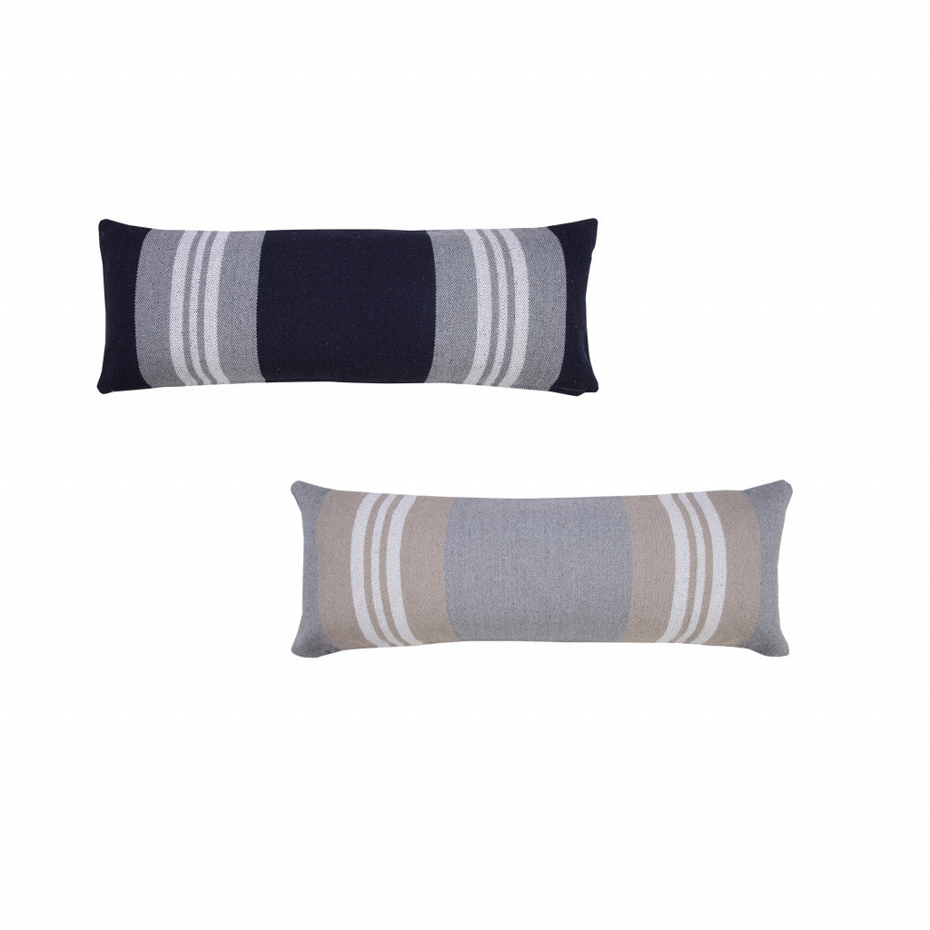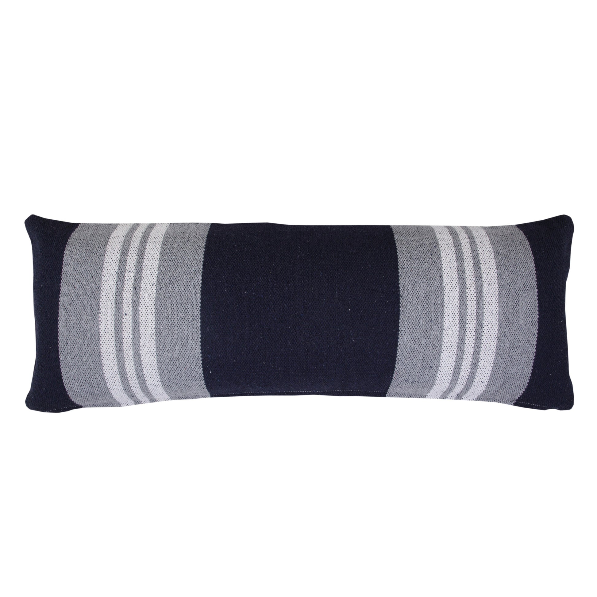 This 14" x 36" navy gray and white 100% cotton coastal zippered pillow will add a beautiful decorative accent to your decor. This super soft decorative pillow is expertly made of high grade, long lasting 100% cotton in a navy gray and white coloration. Decorative throw pillows not only add color and dimension to your space but can be comfy and supportive when you are lounging and cuddling as well. Decorative pillows are a great way to change up the look and feel of your space easily and quickly. 14" H x 14" W x 36" D