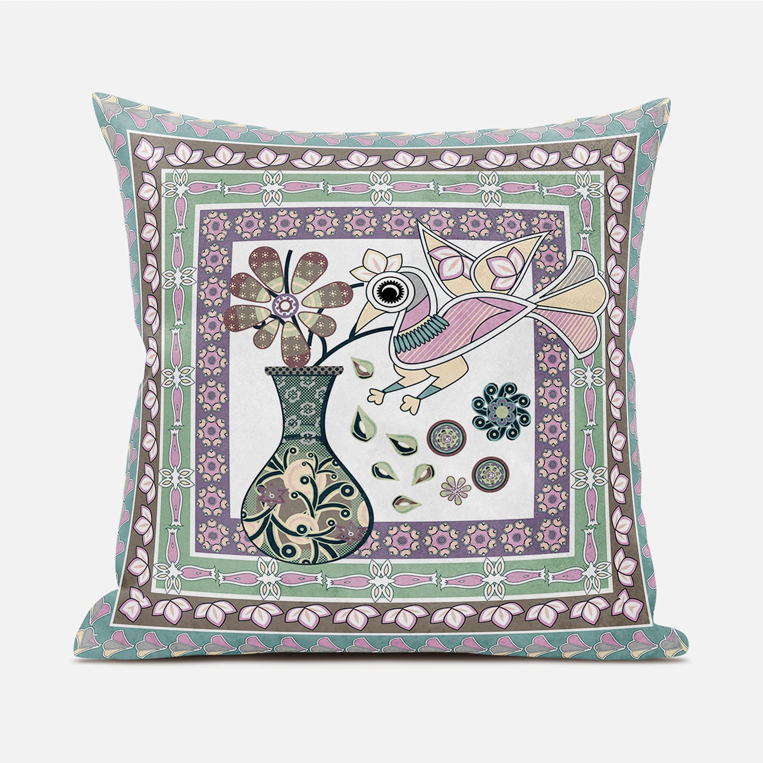 20" X 20" Pink and Brown Peacock Broadcloth Floral Zippered Pillow