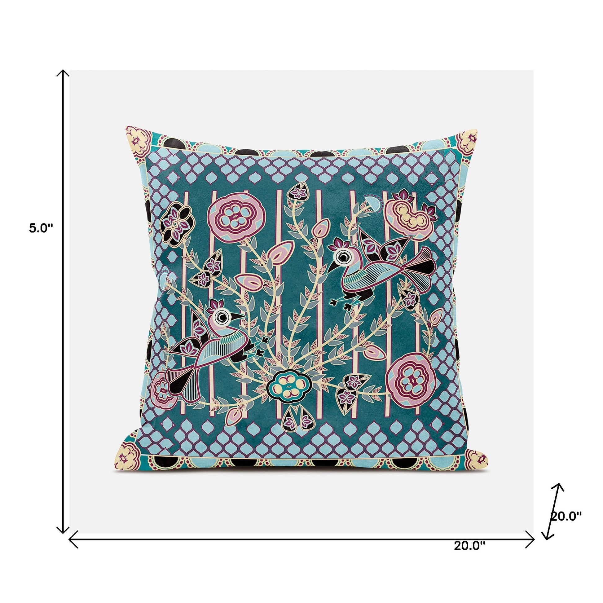 Unique and decorative, this comfortable 20" x 20" pink and green peacock broadcloth floral zippered pillow will leave a lasting impression. This pink and green hued piece represents quality construction, expertly made from durable broadcloth that is not only long lasting but soft to the touch as well. Decorative throw pillows not only add color and dimension to your space but can be comfy and supportive when you are lounging and cuddling as well. A great decorative accessory for your favorite chair, to accent your sofa, or to use as part of your bed ensemble. 5" H x 20" W x 20" D