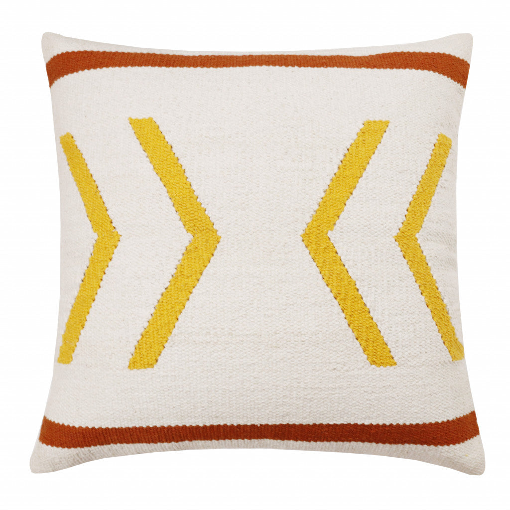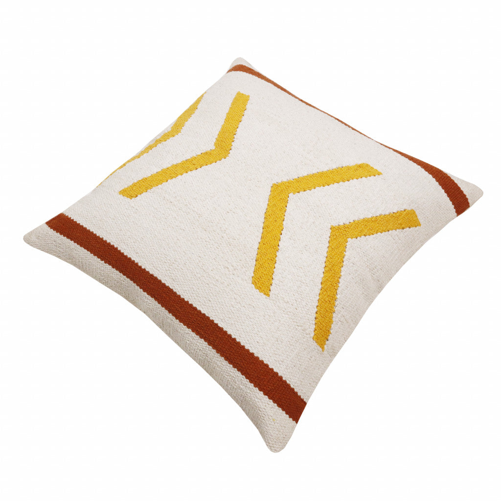 Add an air of fashion to your room and rejuvenate the space with this cute and fashionable 20" x 20" white yellow and red orange 100% cotton chevron zippered pillow. This super soft decorative pillow is expertly made of high grade, long lasting 100% cotton in a white yellow and red orange coloration. Decorative throw pillows not only add color and dimension to your space but can be comfy and supportive when you are lounging and cuddling as well. A great decorative accessory for your favorite chair, to accent your sofa, or to use as part of your bed ensemble. 4" H x 20" W x 20" D