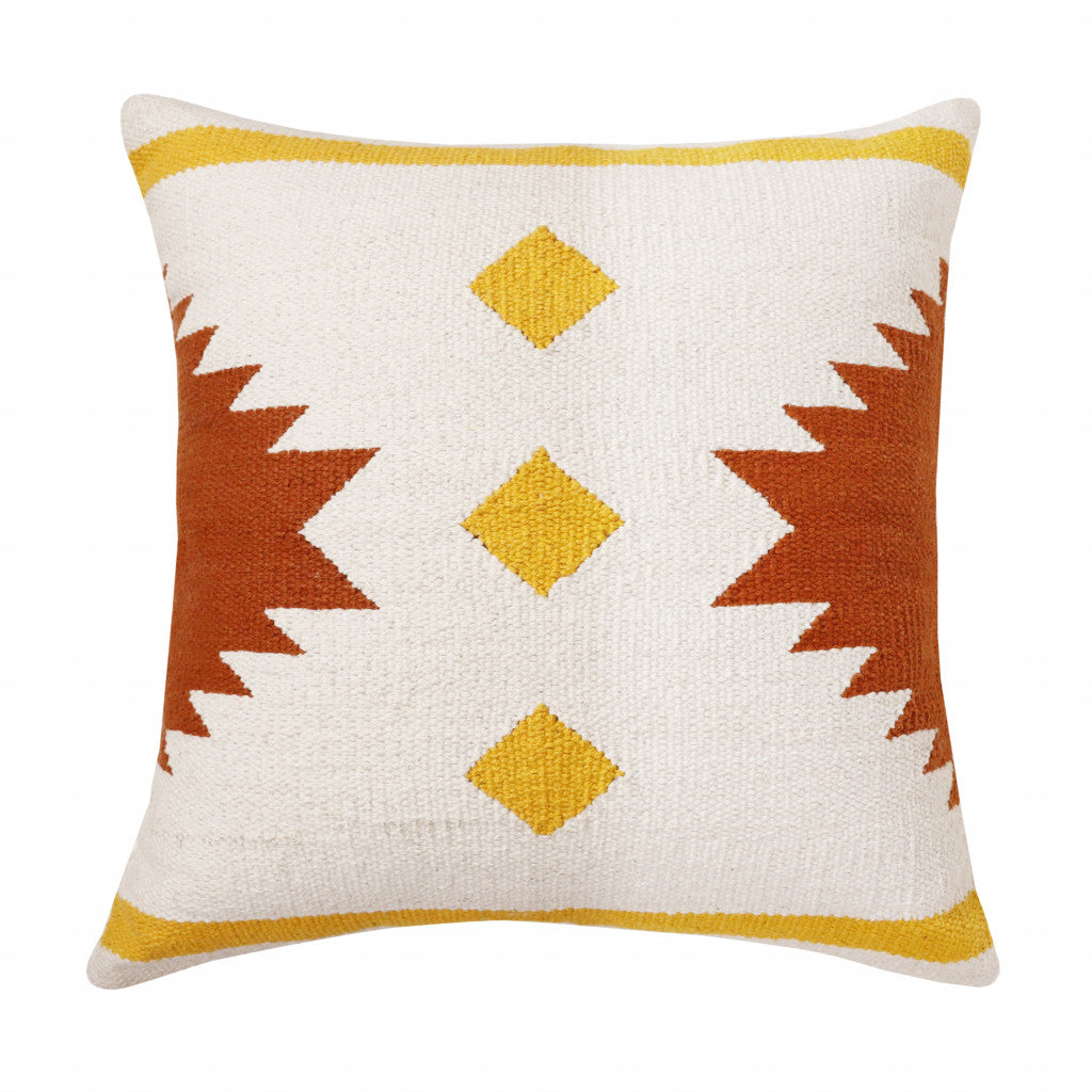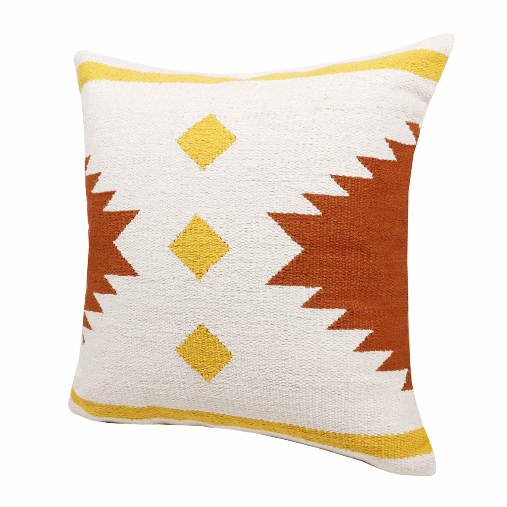 The perfect complement to your sofa, favorite chair, or bed, this 20" x 20" white yellow and red orange 100% cotton geometric zippered pillow is a great decorative accent. This white yellow and red orange colored decorative pillow is made from high grade 100% cotton that makes it super soft to the touch and long lasting. Decorative throw pillows not only add color and dimension to your space but can be comfy and supportive when you are lounging and cuddling as well. A great decorative accessory for your favorite chair, to accent your sofa, or to use as part of your bed ensemble. 4" H x 20" W x 20" D