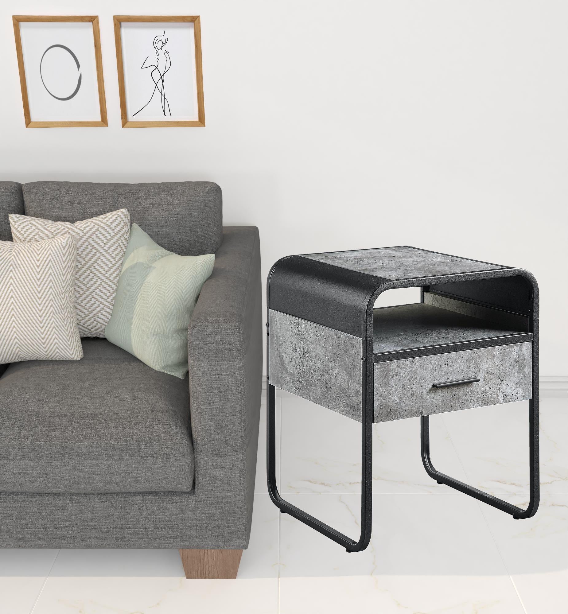 Keywords | wood metal square end table, table drawer shelf, metal square end table drawer, square end table drawer shelf, 22" black concrete gray manufactured |