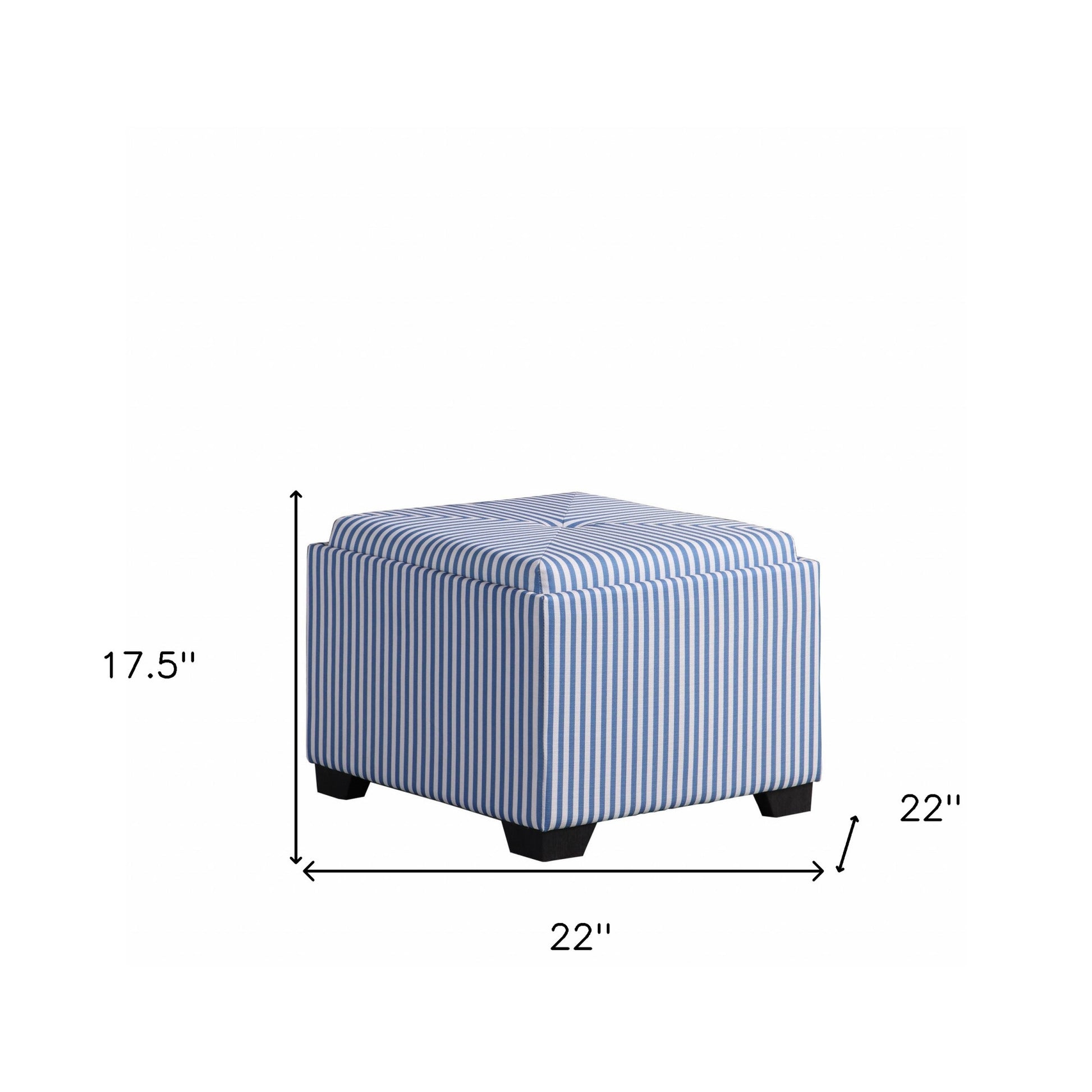 22" Blue And White Faux Leather And Black Tufted Striped Storage