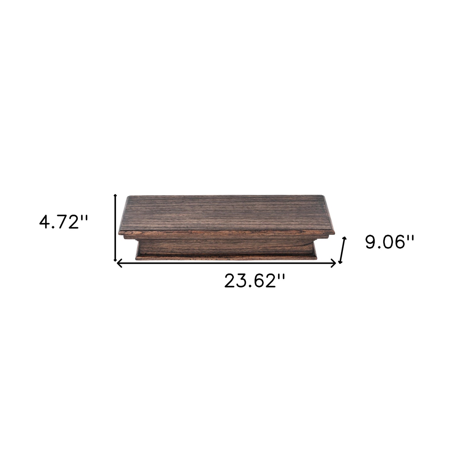 Enhance your living space with our 24-inch rustic brown and black floating shelf. This single floating shelving unit is made of high-quality solid wood and veneer, providing a sturdy and durable frame. The distressed rustic dark brown with black undertones and beveled edges add a touch of dimension to any room, effortlessly blending with various interior styles. Whether you want to showcase your favorite books, display decorative items, or organize essentials, this versatile shelf offers ample storage space. Upgrade your space with our stylish and functional rustic black wash floating shelf. 4.72-inch H x 23.62-inch W x 9.06-inch D