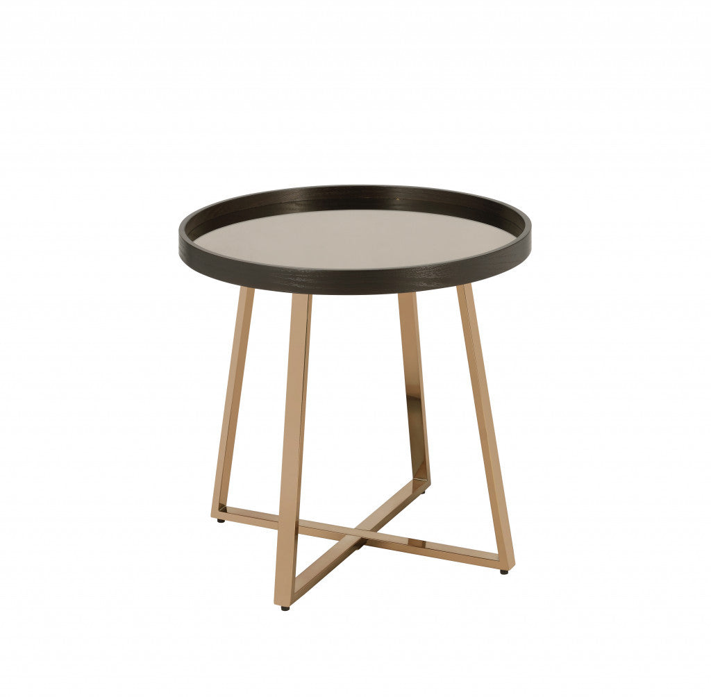 Distinctive in style the 23" champagne walnut and mirrored metal round end table radiates a versatile charm. A champagne metal frame is finished off with a walnut and mirrored top that is the epitome of quality construction and design. Side tables are a great way to flank your sofa, use as an accent next to your favorite chair, or can even be used bedside. You can match it with other pieces to get the ideal look for your place. 23" H x 23" W x 23" D
