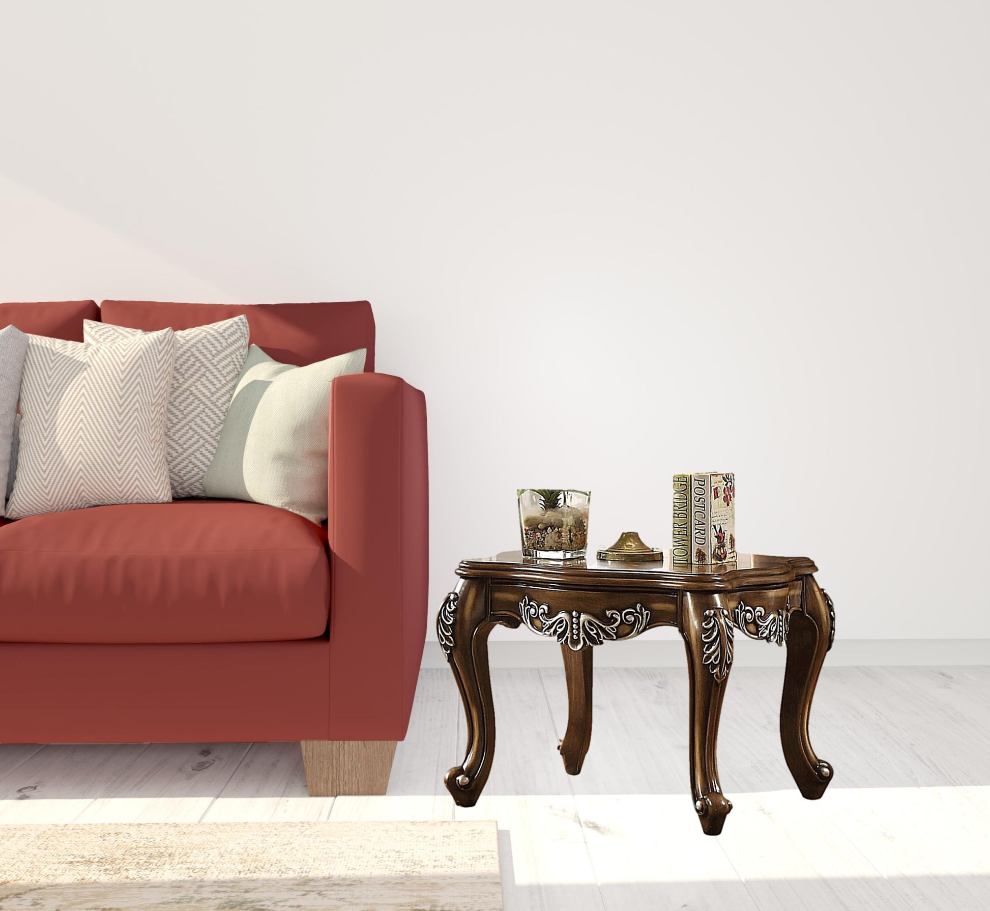 Distinctive in style, the 24" antique oak manufactured wood scallop square end table radiates a versatile charm. Artfully crafted of manufactured wood, this beautiful design is chock-full of fine details. This table is made from manufactured wood in an antique oak color that has a bit of white wash rub to give it a vintage style look throughout the base and top. A great accent on either side of the sofa or bed, this classic and traditional end or side table is just what you need. You can also use it as an entryway table to hold your keys. 24" H x 30" W x 30" D