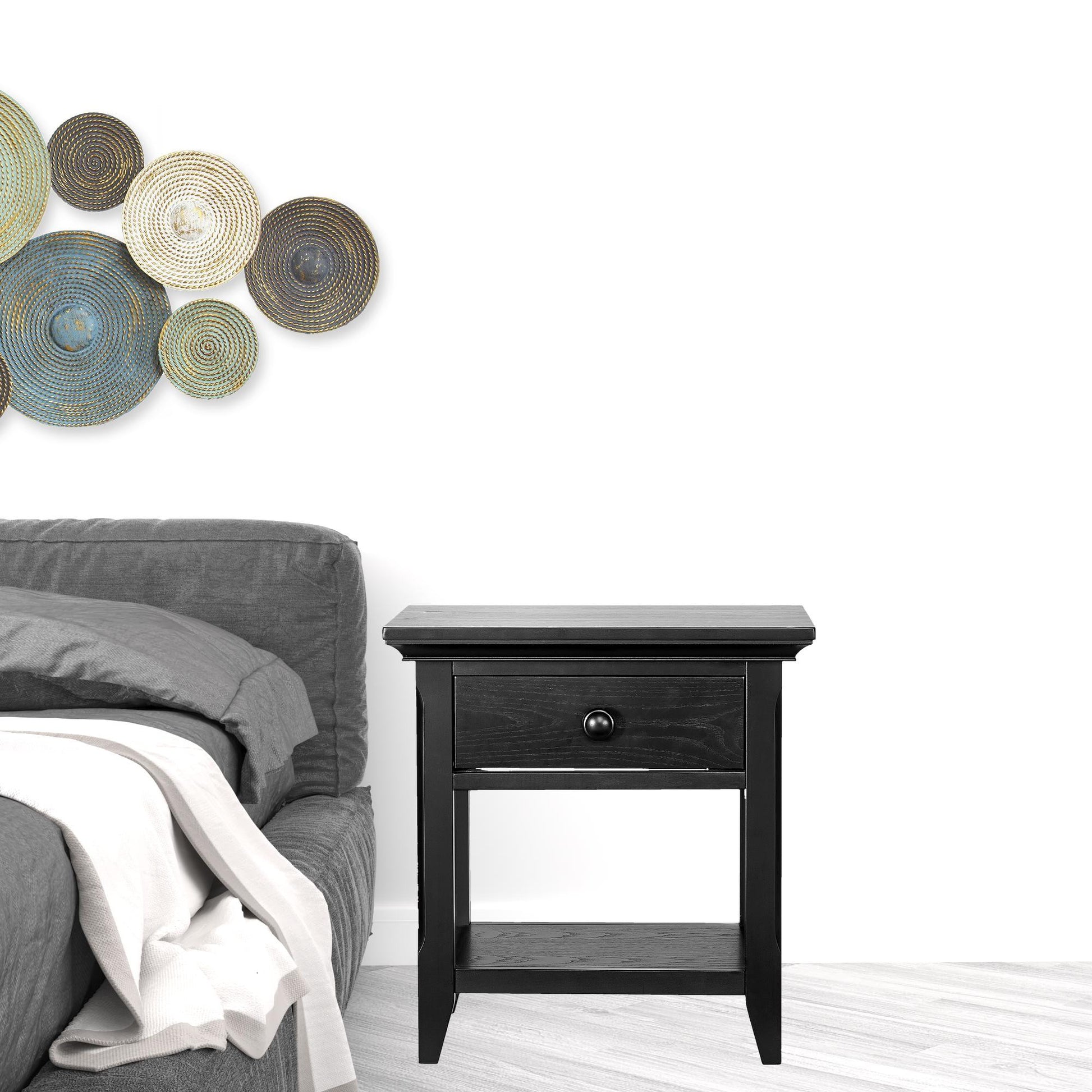 Our 24-inch black one drawer nightstand will compliment your bed beautifully. Made of high quality solid wood that is built to last. The easy open drawer allows you hidden storage to keep your essentials close at hand. An easy-access shelf gives you additional storage and display space. The unsung hero of the bedroom, this nightstand is perfect for keeping a glass of water, lamp, alarm clock, jewelry, and more, close by and easily accessible. Nightstands are obviously great beside the bed but can be used just as easily to help battle clutter in your living room, hallway, office, or dining room. 24-inch H x 26-inch W x 18-inch D