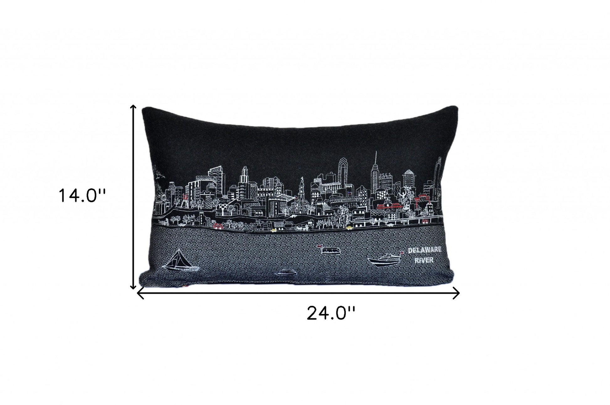 24" Black Philadelphia Nighttime Skyline Lumbar Decorative Pillow