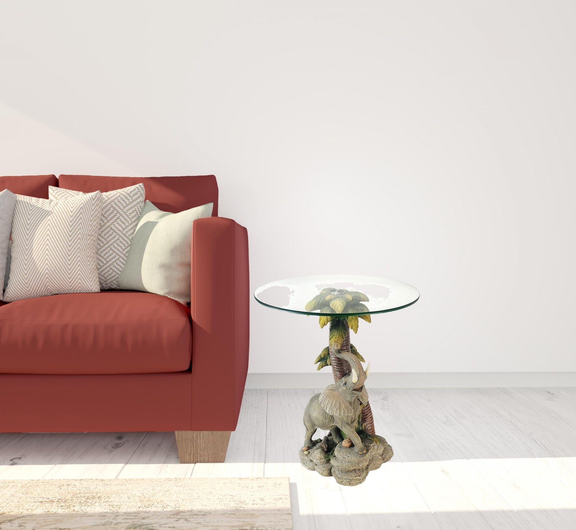 Optimize your space and add some charm to your room with the 24" brown and clear glass elephant round end table. The base of this table is a brown and gray polyresin with a fun elephant under the palm tree. A round glass table surface allows you to see through. A great accent on either side of the sofa or bed, this exotic end or side table is just what you need. You can also use it as an entryway table to hold your keys. 24" H x 19.5" W x 19.25" D