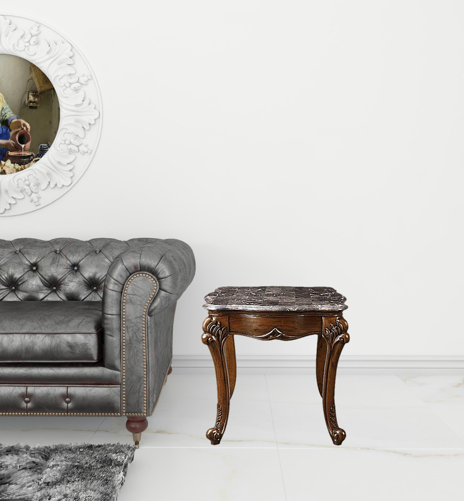 Distinctive in style the 24" cherry and brown marble polyresin rectangular end table radiates a versatile charm. The cherry coloration of the high quality polyresin base marries nicely with the brown marble top. An ideal location for placing your snacks and drinks, and a place to keep your lamp, frames, or other accessories. This versatile table is a great accent for most any room. 24" H x 26" W x 28" D