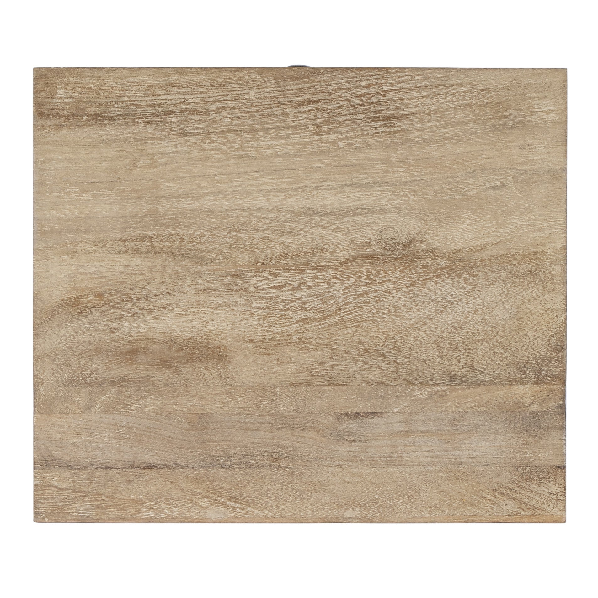 Distinctive in style the 24" natural brown solid wood end table with cabinet and drawer radiates a versatile charm. The natural brown coloration of the high quality solid and manufactured wood base marries nicely with the natural wood solid wood top. This great piece includes hand-carved floral etched designs that add beautiful charm to your space. The purposefully distressed finish gives this table an authentically rustic feel. Includes a single easy pull out drawer and a cabinet for handy storage of life's little essentials. A great accent on either side of the sofa or bed, this adorable end or side table is just what you need. This versatile table is a great accent for most any room. 24" H x 14" W x 12" D