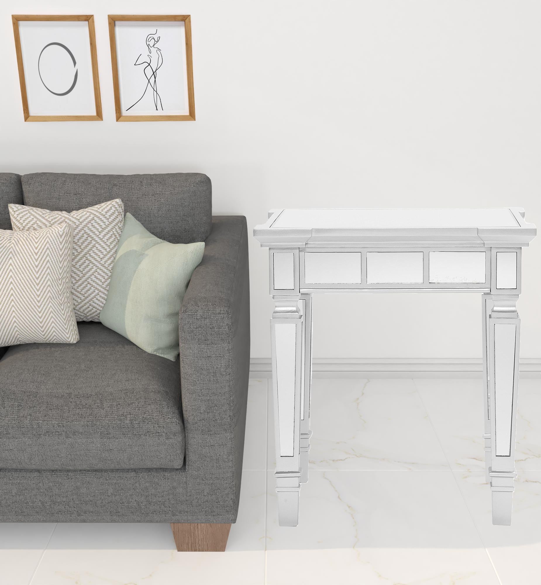 Optimize your space and add some charm to your room with the 24" silver glass and manufactured wood square mirrored end table. This marvelous end or side table is made from high quality manufactured wood. A sleek silver monotone color gives this manufactured wood and glass table a fresh and updated look. Reflective pieces of mirrored glass give this table a glamorous and unique look. Side tables are a great way to flank your sofa, use as an accent next to your favorite chair, or can even be used bedside. This versatile table is a great accent for almost any room. 24" H x 22" W x 22" D