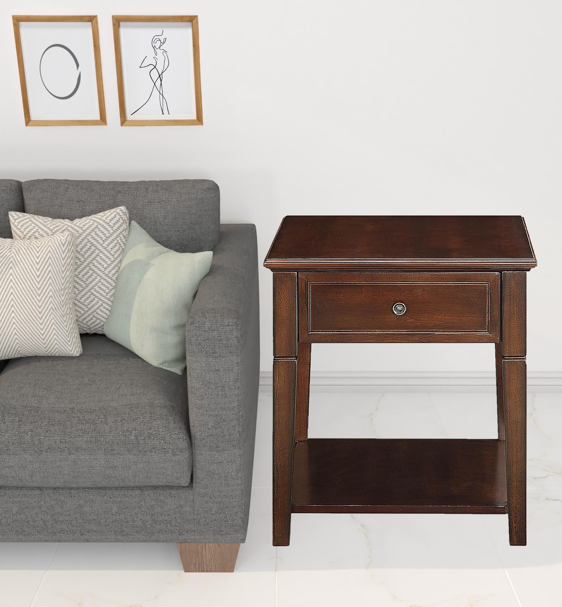 Show off your exquisite taste with this 24" walnut manufactured wood rectangular end table with drawer and shelf. This table is made from manufactured wood in a walnut color throughout the base and top. Includes a single shelf for handy storage or display space. Includes a single easy pull out drawer for handy storage of life's little essentials. Side tables are a great way to flank your sofa, use as an accent next to your favorite chair, or can even be used bedside. You can match it with other pieces to get the ideal look for your place. 24" H x 22" W x 24" D