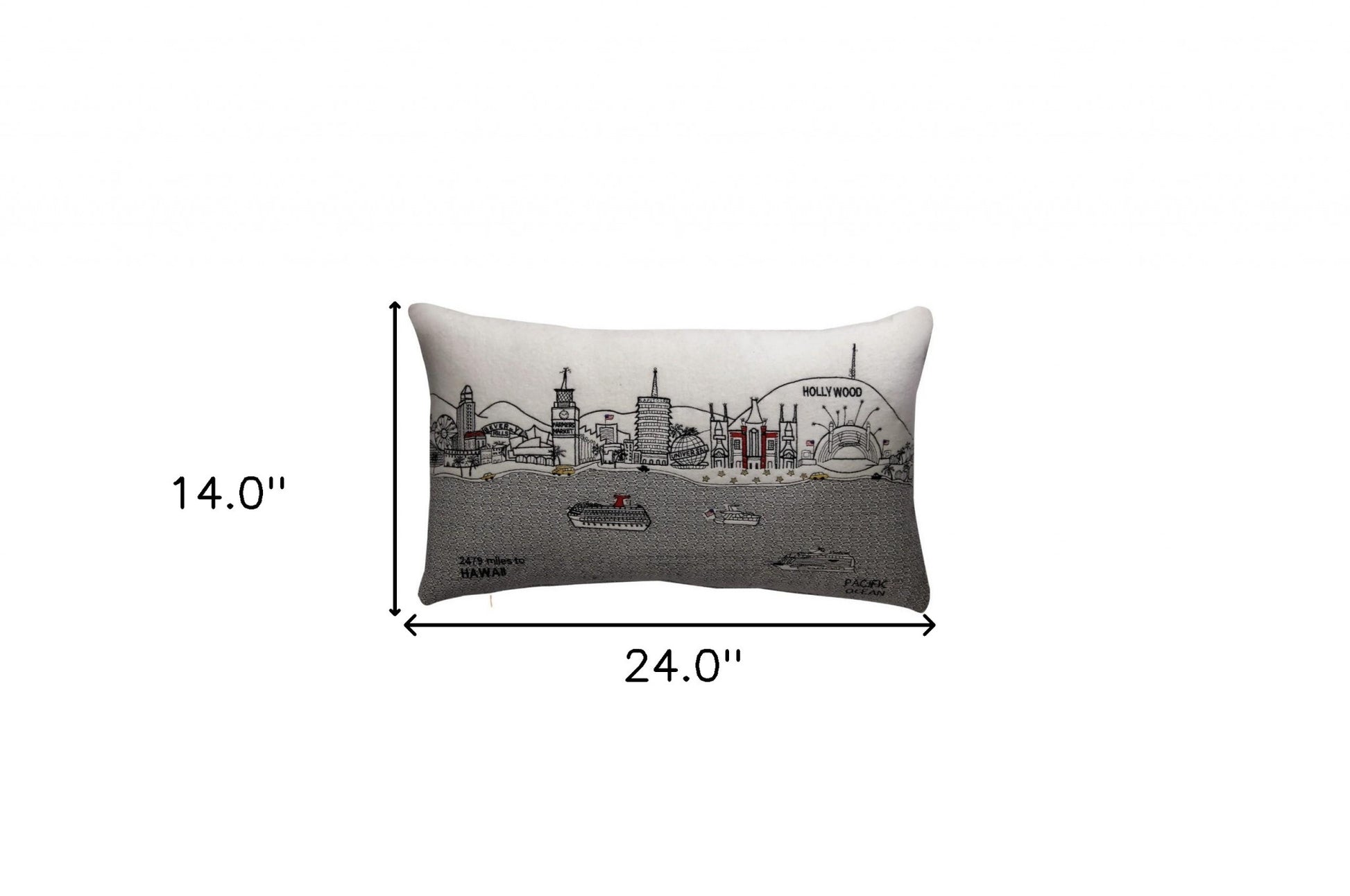 Showcase this world famous city, with our Cream Color Los Angeles Daylight Skyline Prince Size Lumbar Decorative Pillow. The daylight view of the Los Angeles from the Pacific, is picture perfect. The gorgeous art features many famous landmarks and references for this destination city including the Hollywood sign and Beverly Hills, rendering a modern whimsical way to bring this iconic city to life. Made of a wool/nylon blend, this high quality stitched decorative pillow features black on white embroidered artwork mixed with pops of color that highlight important and recognizable icons from this popular California city. This pillow makes a great gift, decorative accent and conversation piece. 4" x 24" x 14"
