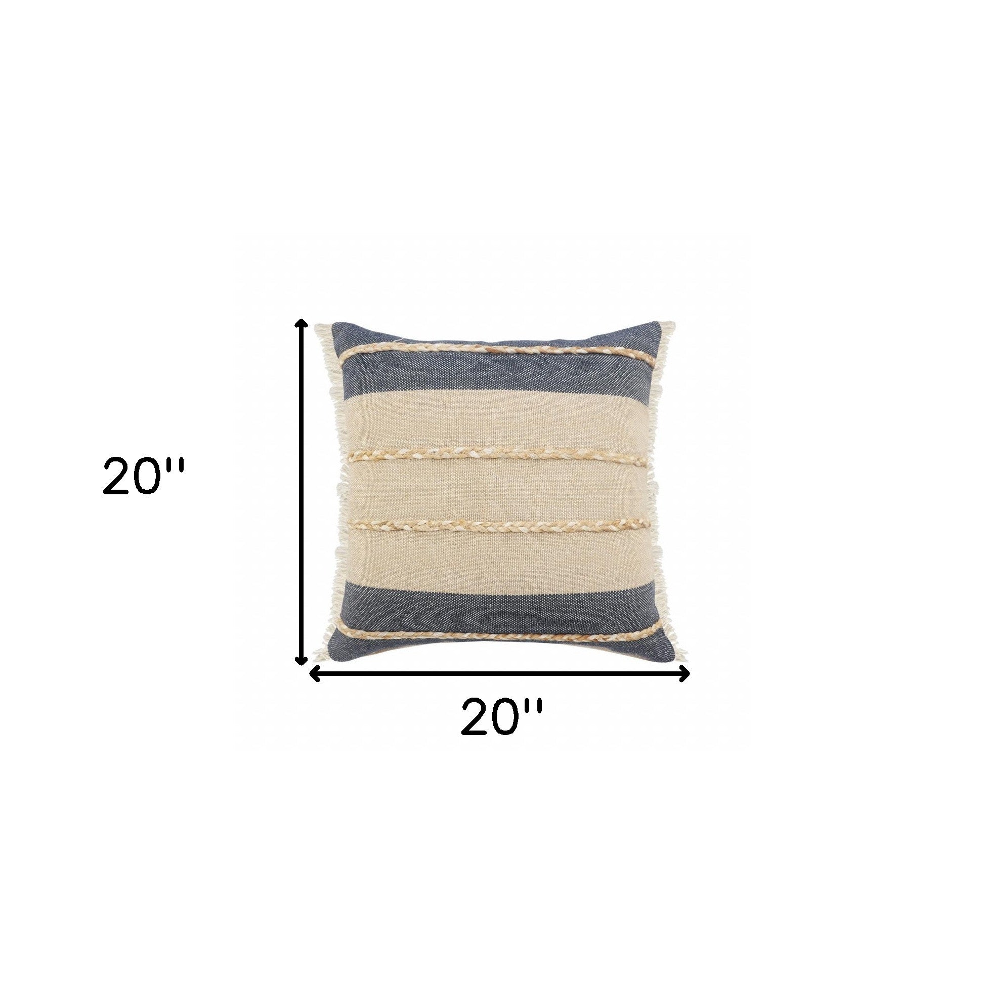24" X 24" Denim Blue Tan And Taupe Jute Coastal Zippered Pillow