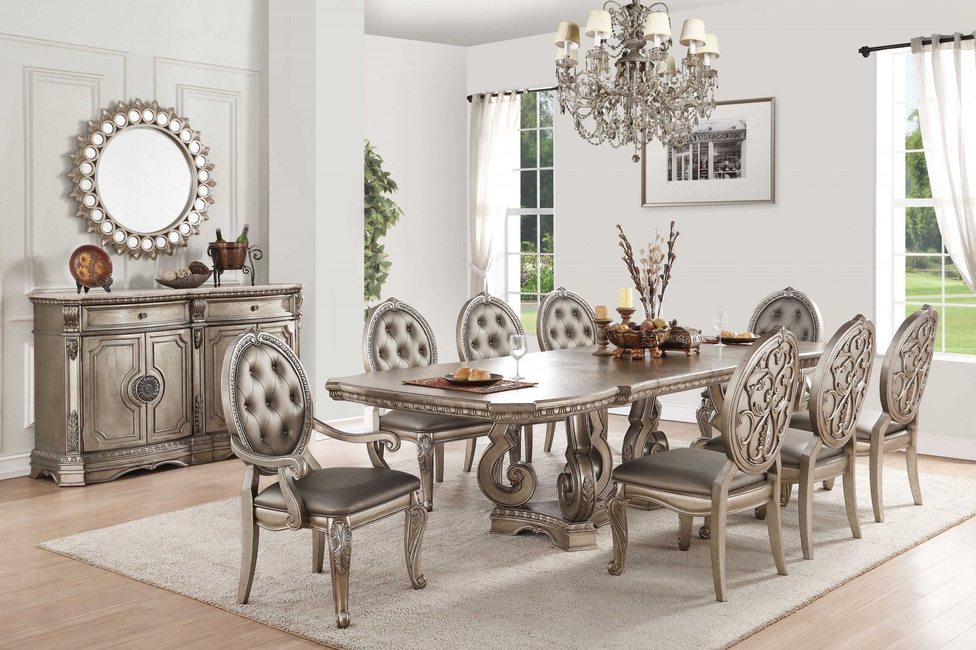 Bring this comfortable set of two tufted champagne upholstered faux leather dining arm chairs to your table to enjoy long lasting quality time with your family and friends. The addition of a tufted design gives this chair some extra special flair. The solid back gives this chair its unique style. Dining chairs are a great way to compliment your kitchen or dining room but can also be used in the foyer, hallway, or any room you might need extra seating. 42-inch H x 24-inch W x 24-inch D