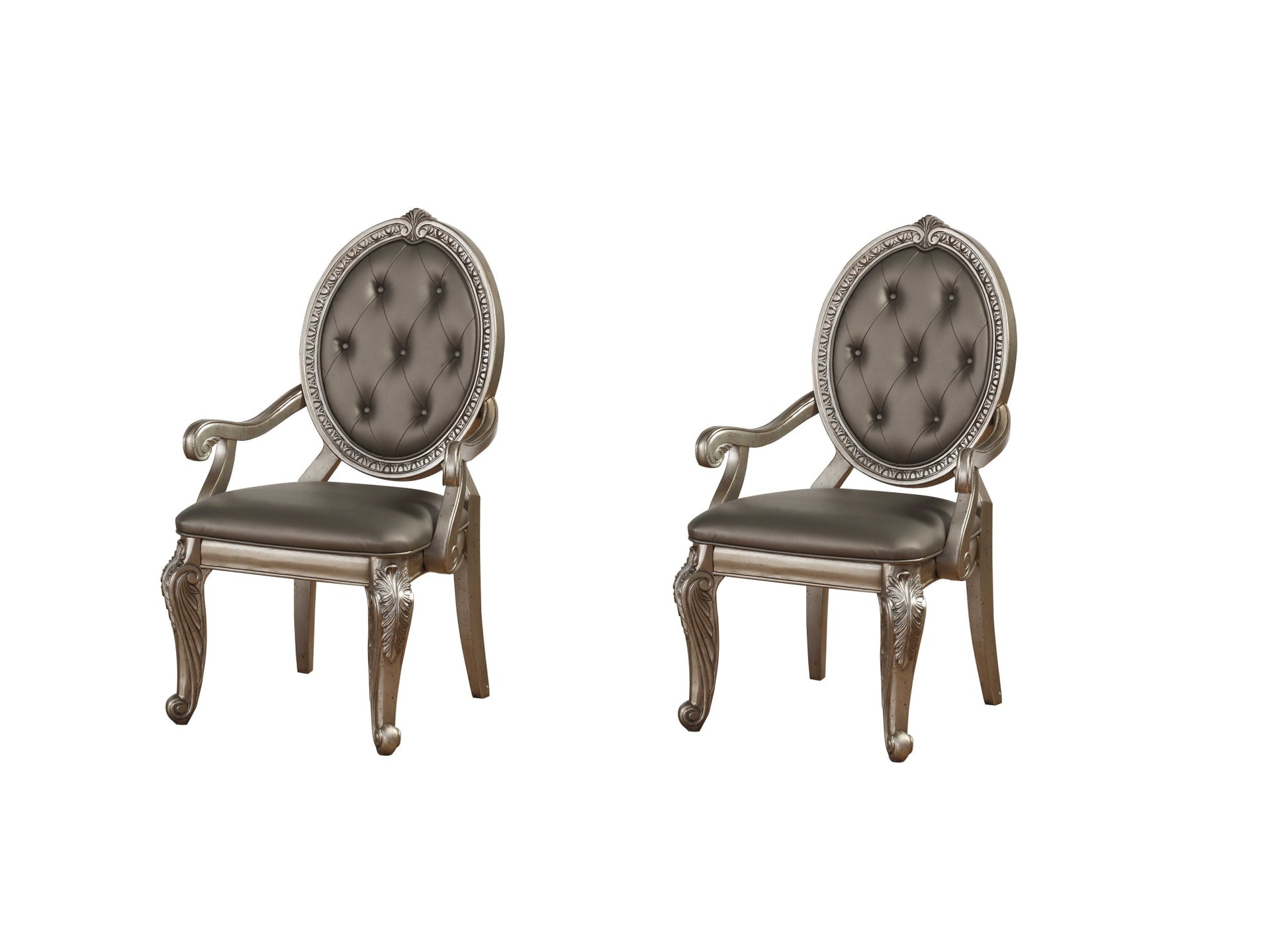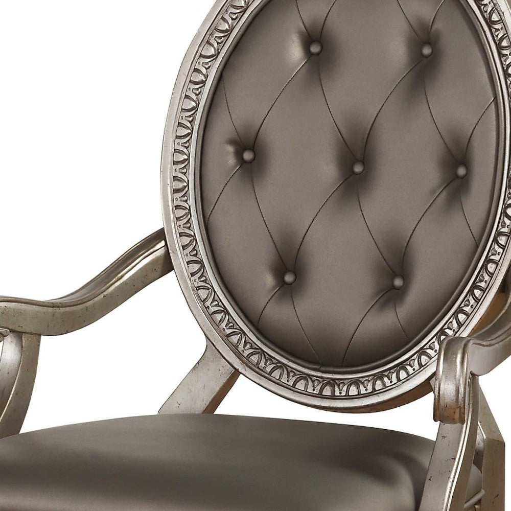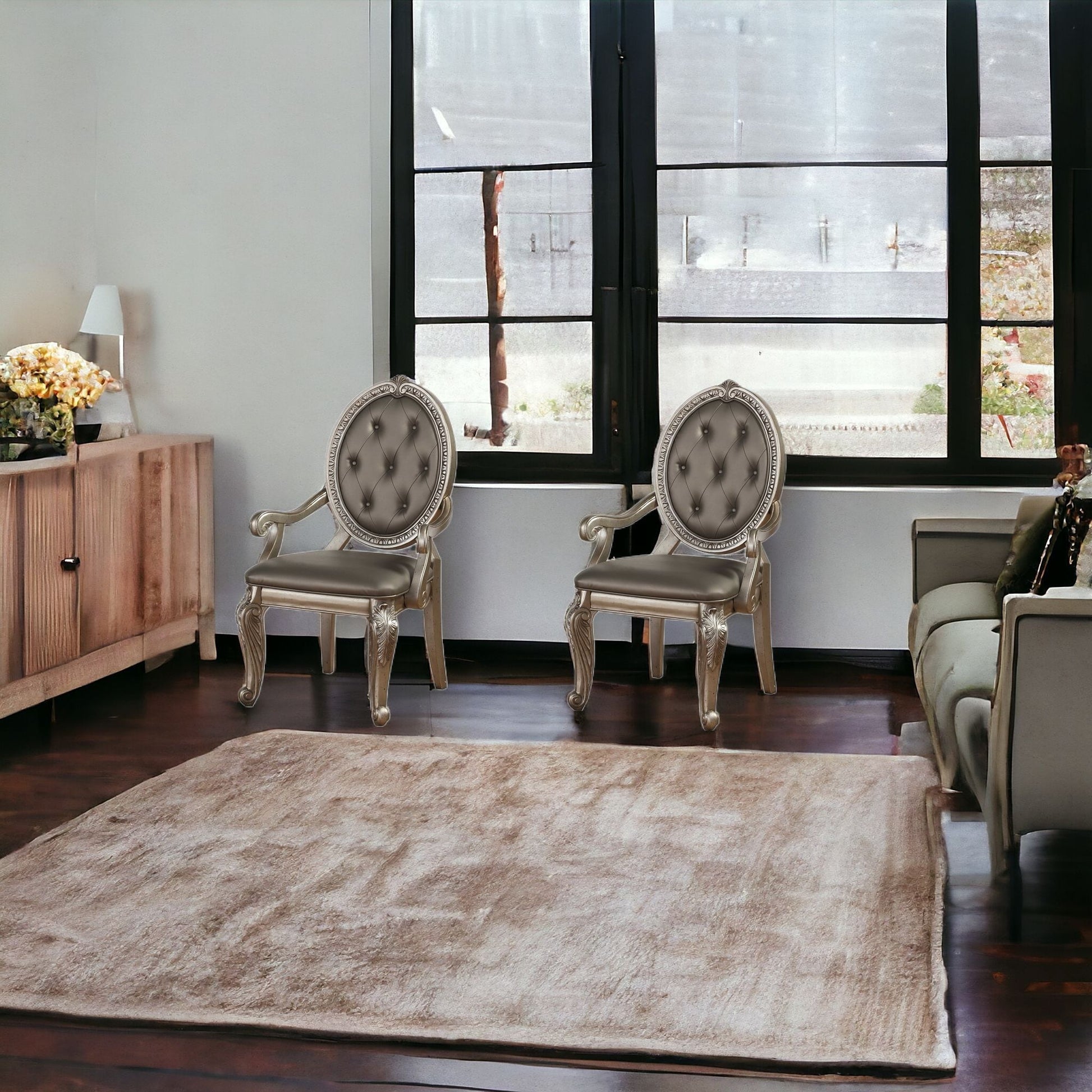 Set of Two Tufted Champagne Upholstered Faux Leather Dining Arm Chairs