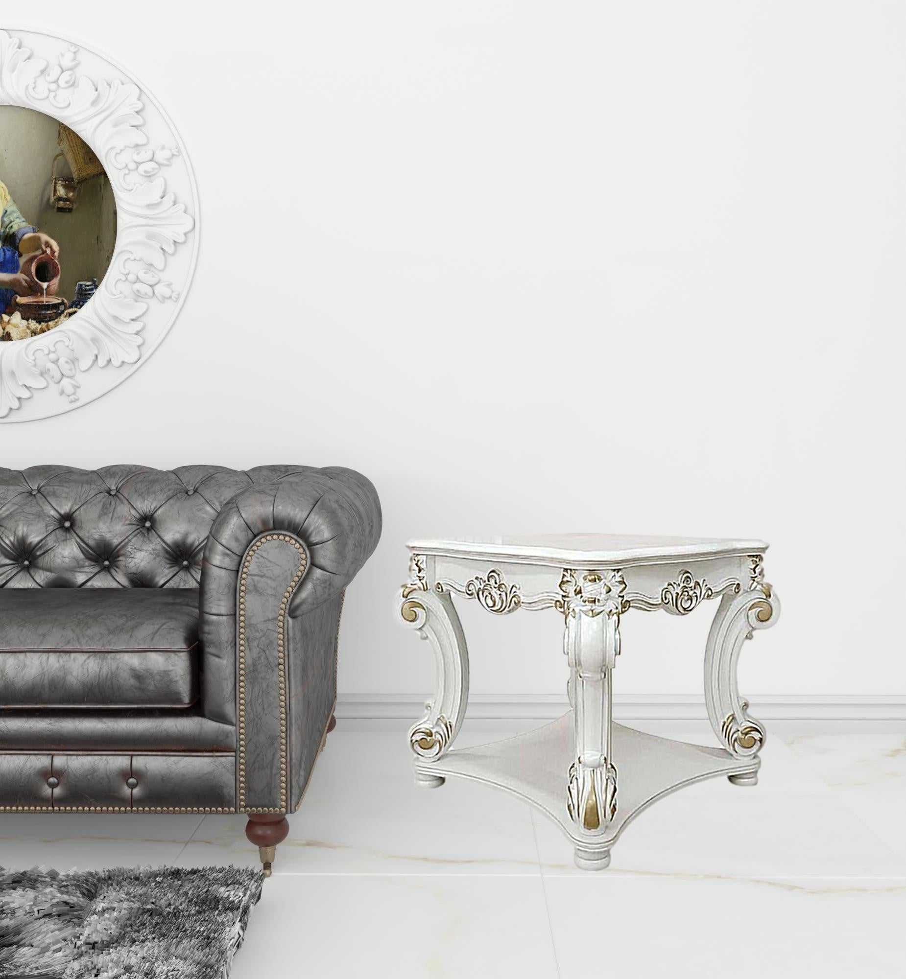 Distinctive in style, the 26" antique pearl manufactured wood square end table radiates a versatile charm. Artfully crafted of manufactured wood, this beautiful design is chock-full of fine details. This table is made from manufactured wood in an antique pearl color throughout the base and top. Side tables are a great way to flank your sofa, use as an accent next to your favorite chair, or can even be used bedside. You can also use it as an entryway table to hold your keys. 26" H x 31" W x 31" D