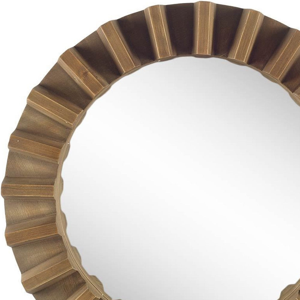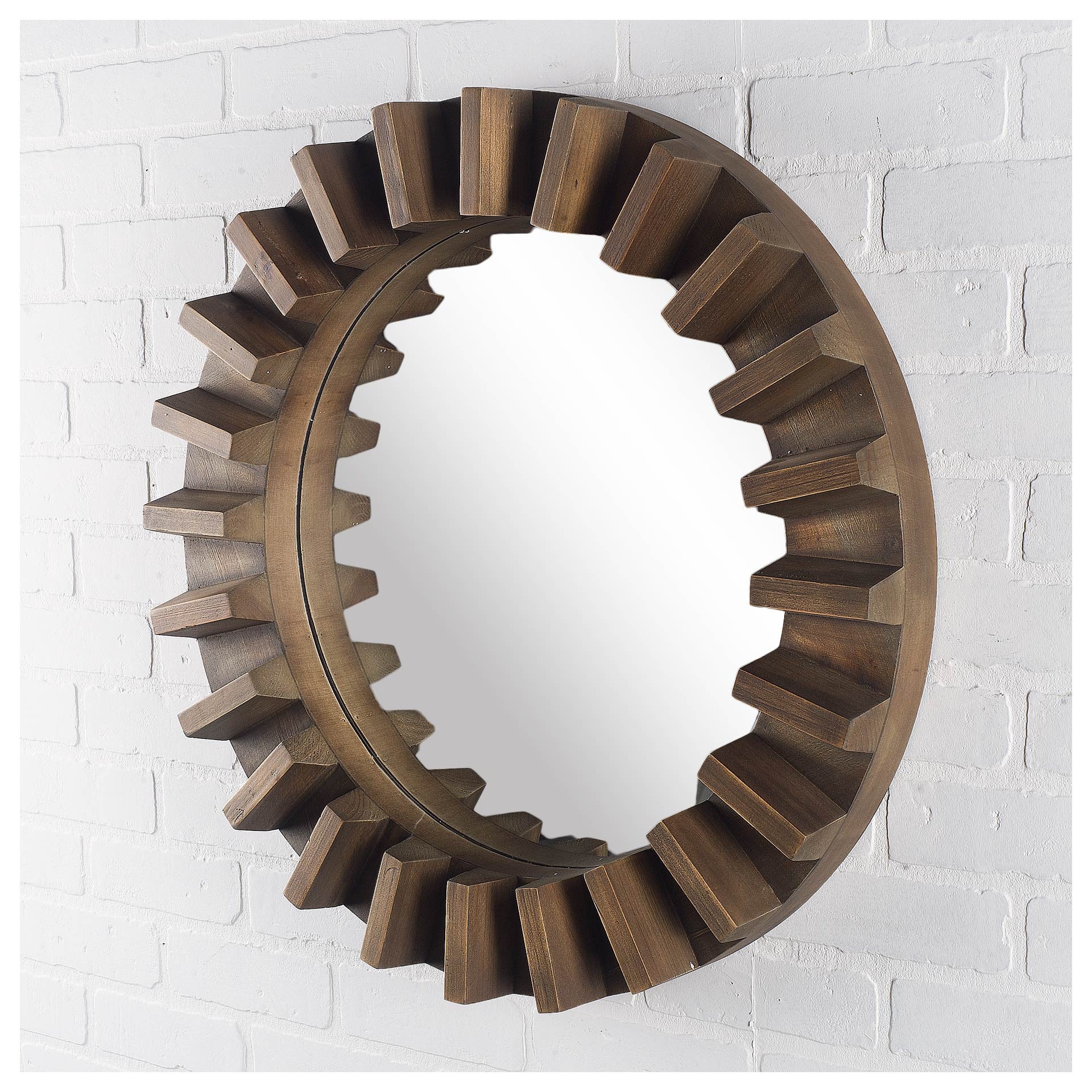 designed to look like sprockets, this mirror will add noticeable variation to your space. whether used alone or paired with other mirrors, this mirror makes a huge difference in your decor. it is held in a brown wood frame; add it to any room and enjoy the exceptional sparkle that ships with it. dimensions: 26".
