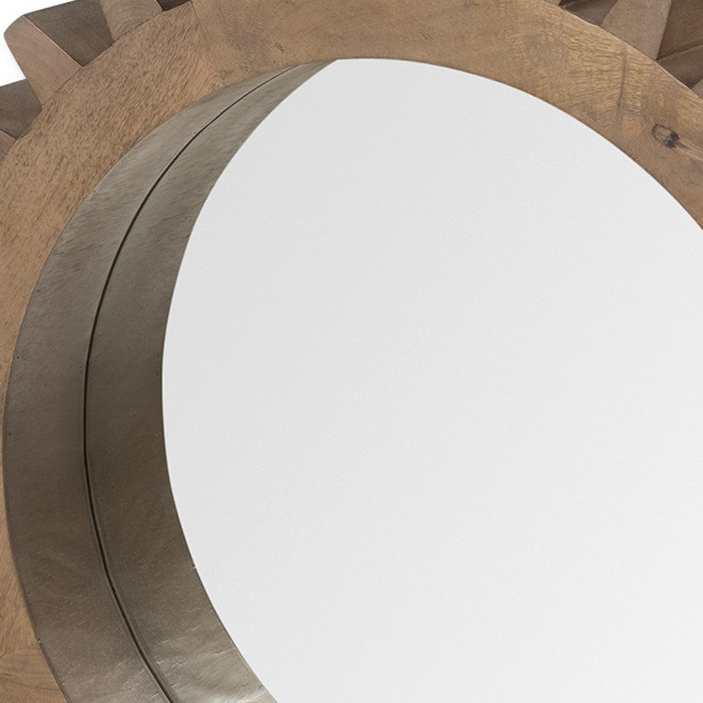 having an industrial design, this mirror will add noticeable variation to your space. whether used alone or paired with other mirrors, this round mirror makes a huge difference in your decor. it is held in a brown cog-like wood frame; add it to any room and enjoy the exceptional style that ships with it. dimensions: 26".