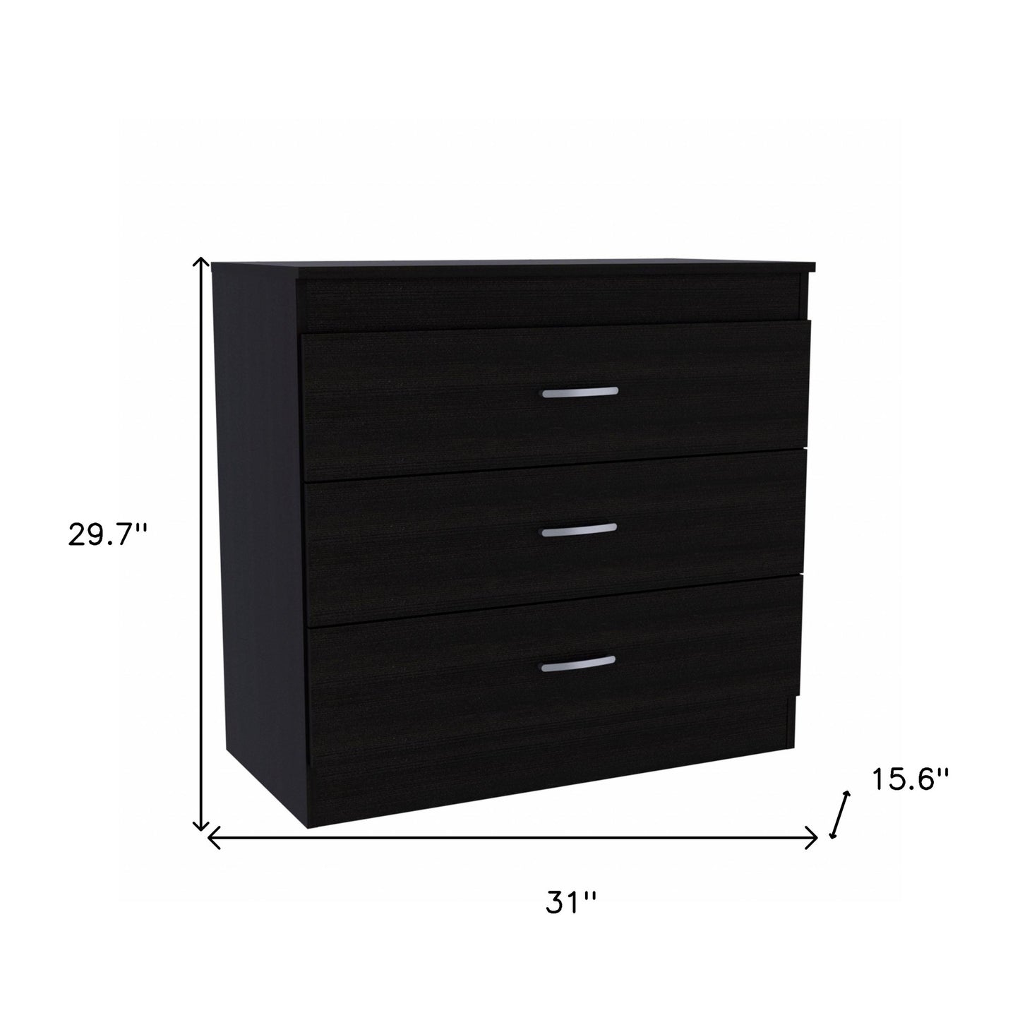 Add personality to your bedroom style and a feeling of coziness with this 31-inch black three drawer dresser. This horizontal standard dresser has a convenient and wide top area for your getting ready needs and supplies. Equipped with three easy open drawers for practical and good looking clothing storage. Its a quality piece, made from high grade manufactured wood. The black coloration gives it an updated, and modern, minimalist design sense. 29.7-inch H x 31-inch W x 15.6-inch D