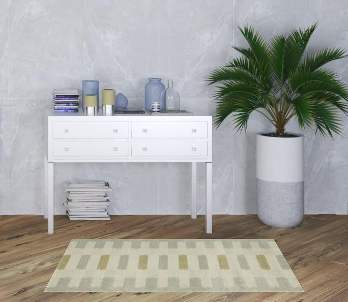3' X 5' Beige Grey Gold And Green Geometric Power Loom Stain Resistant Area Rug